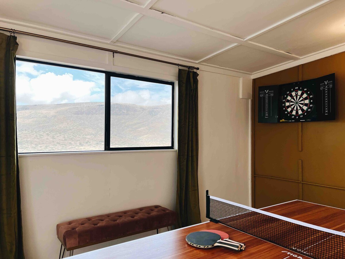 A stylish desert getaway on 4 acres in central Pioneertown, just 5 min walk to Pappy & Harriet's. Perfect for retreats, concert stays, family trips, or Natl Park adventures. ✧ Outdoor Western saloon w/ bar, piano & couch ✧ Hot tub & cowboy pool ✧ 3 bedrooms + 1 sleeping loft (2 king, 2 queen) ✧ 16' ceilings, 1600 sqft (see blueprint) ✧ Larged fenced dog yard ✧ Firepit, 3x patios, BBQ ✧ Tesla charger, fast WiFi ✧ XL indoor bathtub ✧ Hammocks Desert modern luxury meets the spirit of the west.