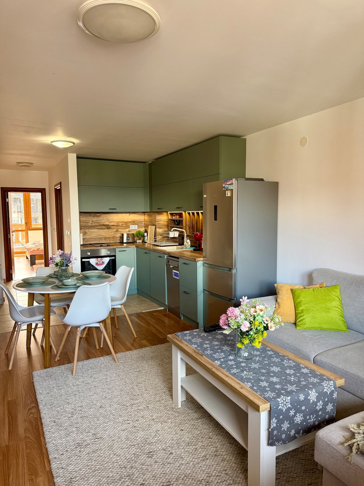 Müasir və dəbdəbəli 2 otaqlı mənzil xizək liftindən cəmi 5 dəqiqəlik məsafədə yerləşir. Bu yaxınlarda çox yüksək standarta uyğun təmir edilmiş, 5 nəfərlik qruplar təklif edir və ideal qış tətili gəzintisi təklif edir. Məkan xizək sürmə gününüzə qədər əla isti örtük üçün buxarı olan böyük bir salon təklif edir. Salonda ikinəfərlik çarpayıları olan 2 geniş yataq otağı və salonda rahat ikinəfərlik divan-kreslo, yağış duşu olan yüksək keyfiyyətli vanna otağı və səhər günəşindən və Pirin dağının mənzərəsindən zövq almaq üçün balkonu var.