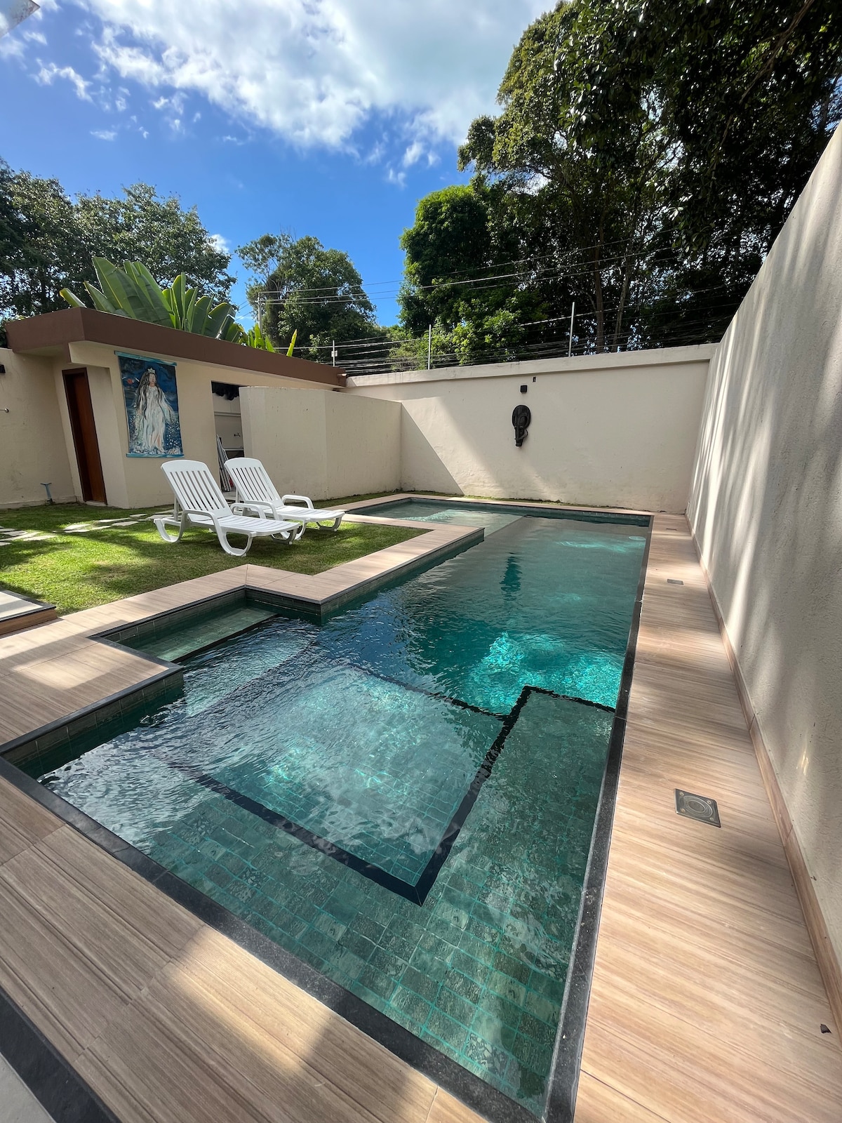 Təbiətlə əhatə olunmuş bu rahat yaşayış yerində bütün ailə və ya dostlarınızla dincəlin. Bu ev tətiliniz üçün ən yaxşı şəkildə hazırlanıb. Ev yenidir və biri birinci mərtəbədə olmaqla 03 süitası və iki üstün süitası, tam mətbəxi, qurman sahəsi, ayrıca hovuzu və 2 avtomobil üçün yeri var MÖVQE - çimərlikdən 100 metr, bərədən 800 metr, Eko Parque-dən 2,3 km və Mucuge küçəsindən 3 km məsafədədir. QEYD: QEYD: Qonaqlama zamanı istifadə olunan hər kwt enerjiyə görə R$ 0,90 tuturuq.