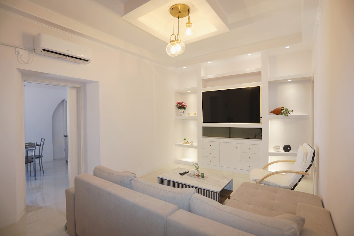 Adanın əsas vilajı olan Çora şəhərində yerləşən bu mənzil adanın ən mənzərəli restoran və barlarından bir neçə metr aralıda, eyni zamanda gecə həyatının səs-küyündən tənha yerləşir. Yataq otağı ənənəvi mağara üslubunda (pəncərə yoxdur), mətbəx və qonaq otağında isə kifayət qədər təbii işıq və (iki böyük pəncərə və şüşə qapı) dənizə və məskunlaşmış təpəyə baxır.