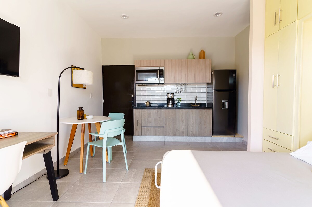 LOFT "A" Cómodo y equipado alojamiento chico tipo loft para una estancia agradable; CAMINANDO llegarás en 3 min. a la playa-malecón, a la vuelta esta el estadio de baseball de los venados, el central park, el nuevo acuario , enfrente esta la Gran Plaza y muy cerca está la zona dorada en donde encontrarás infinidad de restaurantes y antros para tu diversión. El lugar está en avenida hay mucho tránsito de vehículos y personas rumbo al malecón y playa. Perfecto para parejas y viajeros solitarios