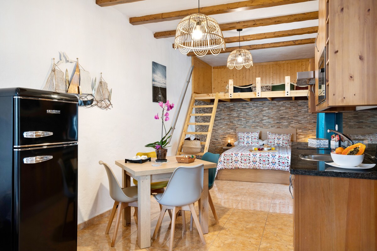 Stay in one of two charming 80 sq m modern hippie apartments with a unique view of Timanfaya National Park and its volcanoes. The apartment features a fully equipped kitchen, a living room with panoramic sliding doors and a sofa bed, HDTV, fiber optic internet, and a bedroom with a Canarian-style en-suite bathroom. Relax on your private terrace, dip your toes in the César Manrique saltwater pool, enjoy the endless vistas, and marvel at magical sunsets. 🩵