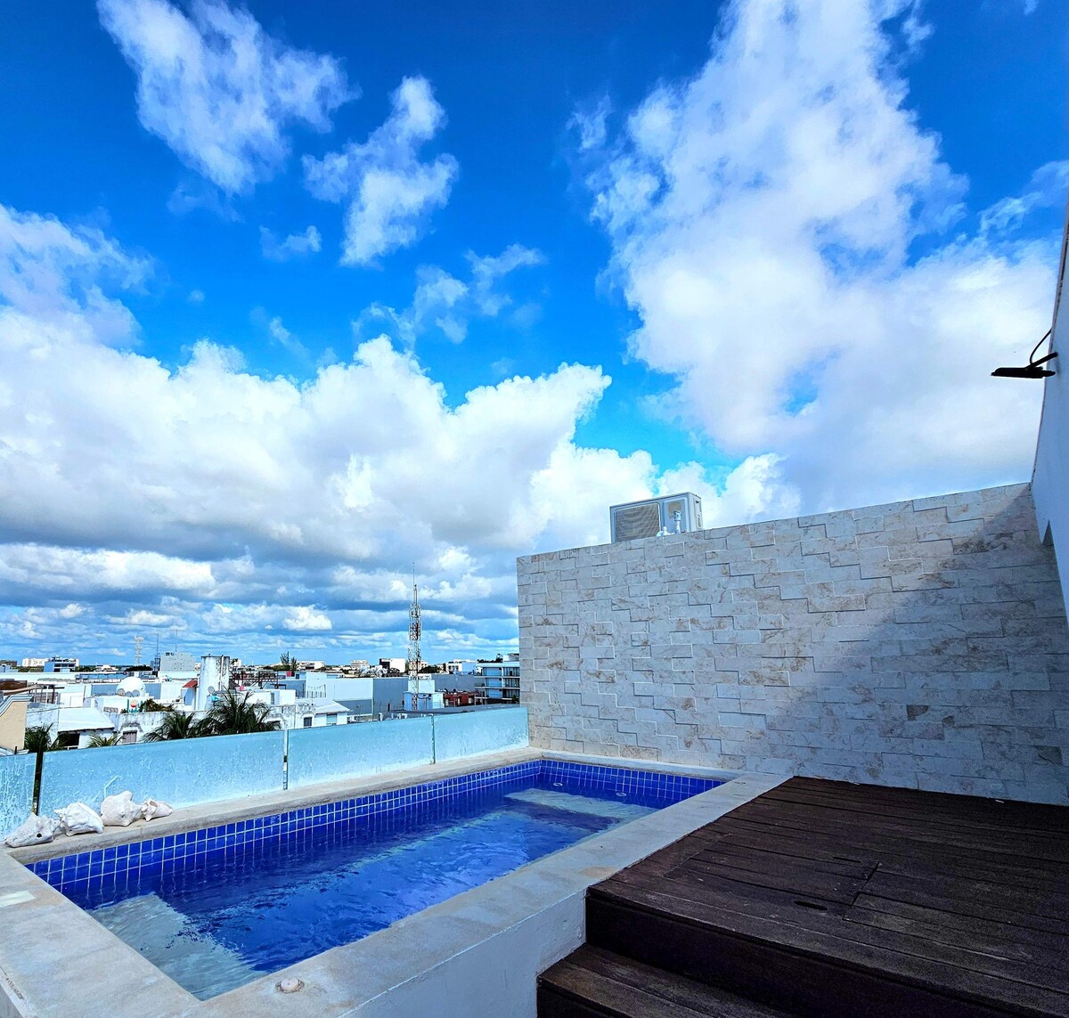 Bu lüks 2 yataq otağı, 2,5 hamam otağı olan mənzil Playa del Karmenin düz mərkəzindədir və King ölçülü çarpayısı və 3 birnəfərlik çarpayısı var. Karib sularında günəşin doğmasını seyr edə bilməyiniz üçün cakuzisi ilə gözəl bir terras var. Rənglərin simfoniyası! Və ya möhtəşəm damımızda hovuzda / vannada dincəlməyə vaxt ayırın.