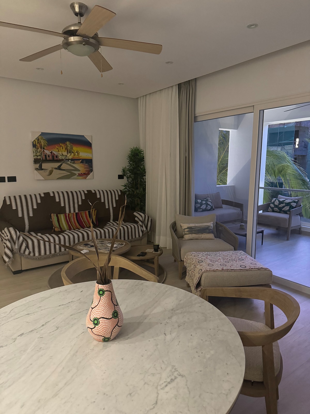 A solo 1 minuto caminando de la playa privada (visible desde la puerta del apartamento), ubicado en área más exclusiva de Bayahibe, Dominicus. Dentro del exclusivo resort Cadaqués: 3 piscinas, muelle privado, parque acuático, restaurante, bar-café, jardines tropicales, Cama king cómoda y sábanas de 300 hilos, A/C de 24,000 BTU, silla columpio (hasta 350 lb), cocina equipada, WiFi rápido y Smart TV, libros, juegos de mesa. Todo listo para que vivas una estadía inolvidable y cómoda en el paraíso!