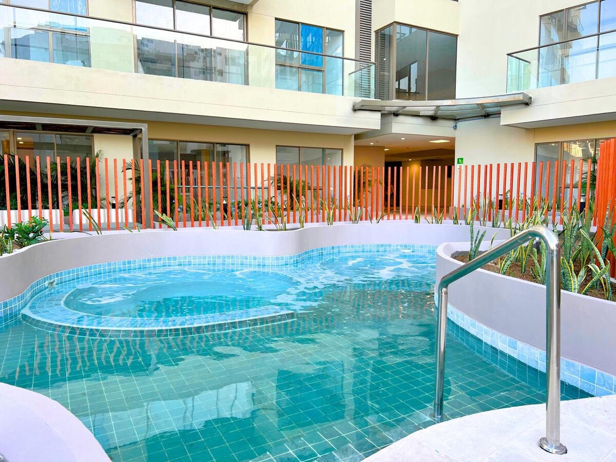 Comodo apartasuite con vista al mar, Edf. con: jacuzzi. piscina en terraza. sauna. turco. dispondrás de cocina completa y equipada. aire acondicionado. ventilador de techo. 2 Smart tv. reproductor de sonido. 2 camas dobles con colchones resortados, 1 amplio sofacama de más de 1.90 Mt de largo. ubicación estratégica, será muy fácil planear tu visita, en rango de 1 a 3 cuadras. cuentas con más de 4 supermercados droguerías. restaurantes. el mar. acuario. un centro comercial. agencias de turismo.
