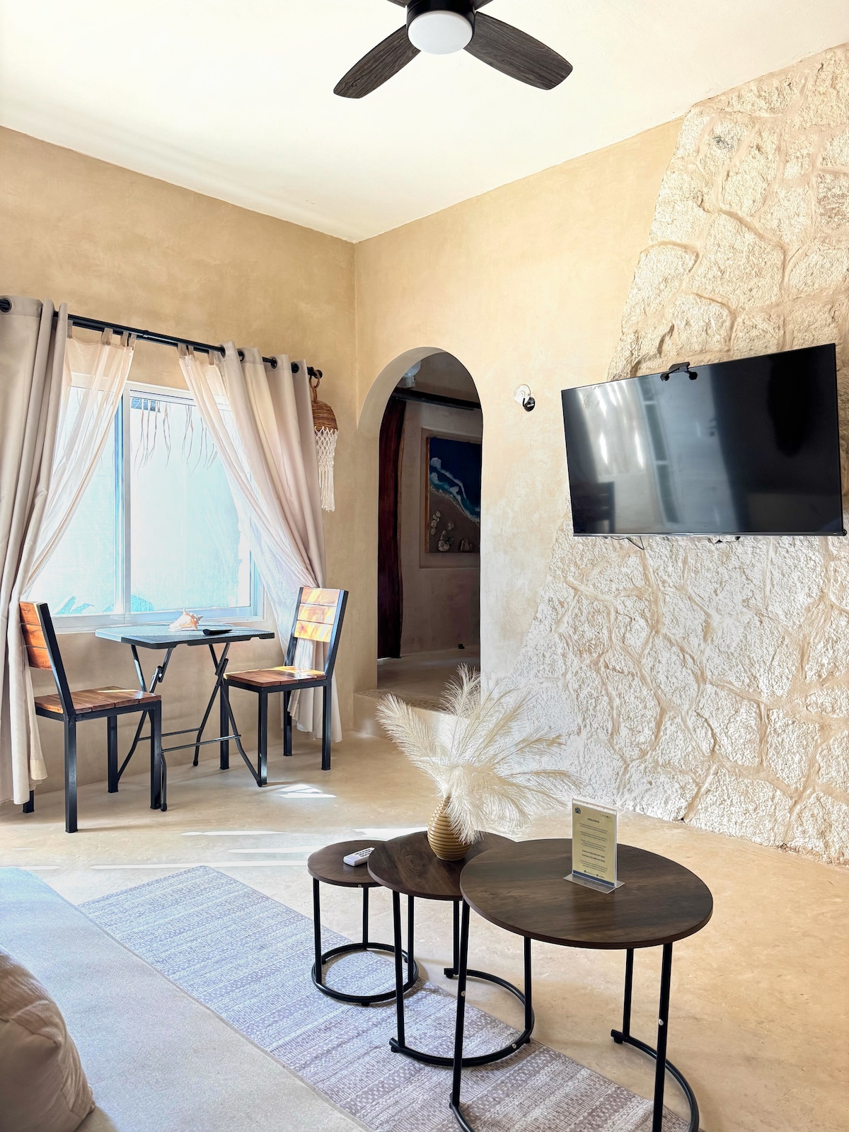 🌴 Departamento con vista al Mar Caribe 🌊☀️ Disfruta de amaneceres espectaculares 🌅 y noches con la luna reflejándose sobre el mar 🌕. Habitaciones con entrada independiente, baño privado, terraza con hamacas y camastros, y una pequeña piscina compartida para relajarte. ⚡ Nota importante: Al cruzar la calle se encuentra una planta de luz que se enciende ocasionalmente y puede generar ruido. Recomendado para personas que no sean sensibles al ruido.