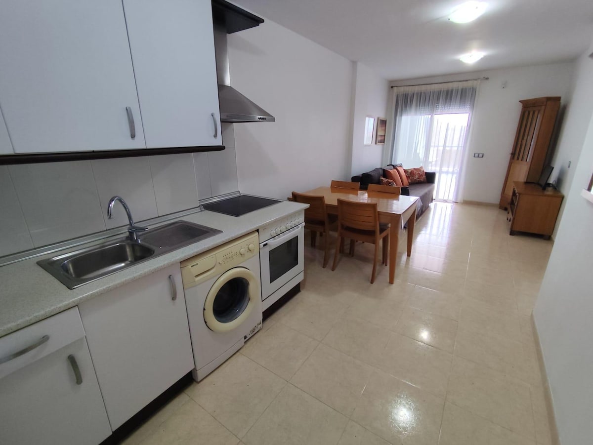 Apartment on the beachfront very well equipped. Pool. Sea views. Sauna. Private parking, WIFI, air conditioning and heating ducts. Gym. Tennis and paddle tennis courts at no extra cost. Exit to the direct beach. Prime videoTV. Ideal for working from home. Quiet urbanization next to the natural area of Punta Entinas. To walk along the beach and very close to the golf course. In winter, indoor-pool.