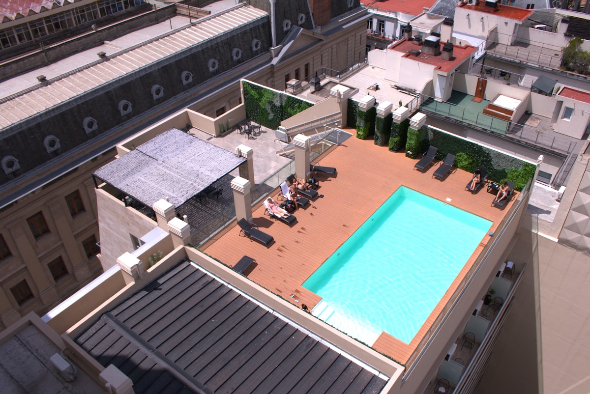 Ubicado en pleno casco histórico de BA, cerca de los puntos turìsticos mas importantes de la Ciudad. Casa Rosada , San Telmo , Puerto madero, Cafe Tortoni, Cafe La Ideal, Obelisco y muchos otros. Cercano a todos los medios de transporte publico y rodeado de restaurantes, supermercados y Farmacias Cuenta con Piscina climatizada, Espacio Co work, Laundry y una terraza con vistas a la ciudad. El edificio tiene seguridad las 24 horas, wifi y todos los servicios para que tu estadia sea perfecta
