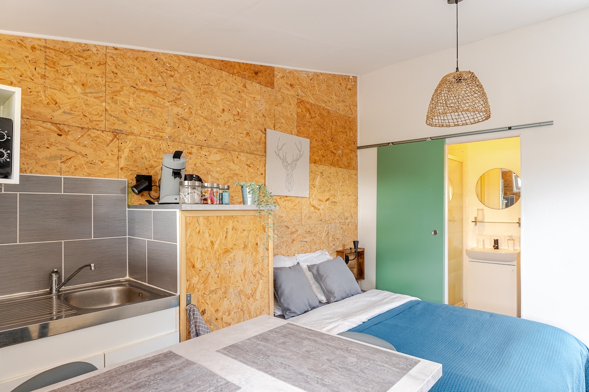 Kraliça ölçülü ikinəfərlik divan çarpayısı, çanaq balaca mətbəxi və ikiqat isti plitəsi, tassimo soyuducusu və qəhvə maşını + kapsulları, mikrodalğalı sobası, 2 tənzimlənən hündürlüklü oturacağı olan dönər masası olan studiya. Ofis sahəsi One. WC və çanaqlı duş otağı. Şkaf, TV. fan, pulsuz WiFi.