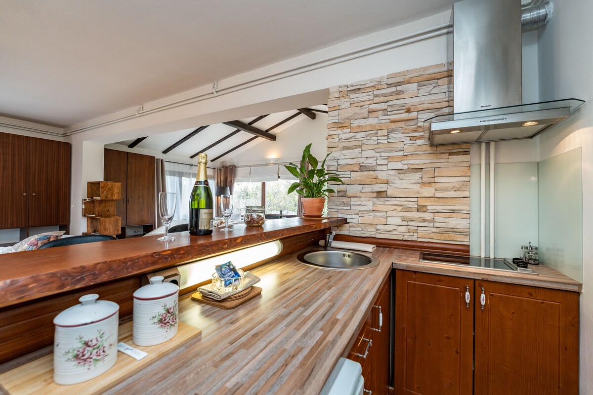 Plitviç Gölləri Milli Parkının yaxınlığında, toxunulmamış təbiətdə gizlənən, çay kənarındakı valehedici kabinəmizdə tətil keçirin. Meşə və sakitləşdirici axın səsləri ilə əhatə olunmuş bu kənd üslublu, lakin rahat dəyirman daxması şəxsi cakuzisi olan sakit təbiət məkanı axtaran cütlüklər və ya tək səyahətçilər üçün mükəmməldir. Quşların cıvıltısı ilə oyanın, səhər qəhvənizdən su kənarında zövq alın və şəlalələri, gəzinti yollarını və yaxınlıqdakı təbiət görməli yerlərini kəşf etdiyiniz gündən sonra açıq havada yerləşən cakuzidə dincəlin.