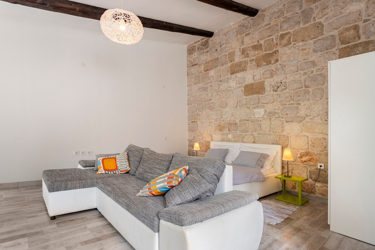 Ən yüksək keyfiyyətli materiallarla tamamilə və sevərək təmir etdiyimiz 2 ayrı mənzildən ibarət köhnə daş ev. Açıq hava sahəsi Braç adasından gətirilmiş ağ daşdan (eynilə “Ağ Ev”in sütunları kimi) hazırlanmışdır. Qonaqlarımız üçün tikan mebeli və həmçinin barbekü mövcuddur.