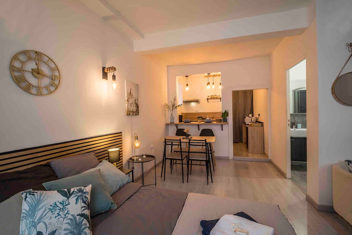Profitez d’un séjour d’exception dans ce spacieux appartement de 85 m², entièrement rénové et climatisé. Pensé comme un véritable cocon pour les familles, les groupes d'amis ou les voyageurs d'affaires, ce logement se distingue par ses volumes généreux et sa luminosité, offrant une vue apaisante sur le jardin et les montagnes.