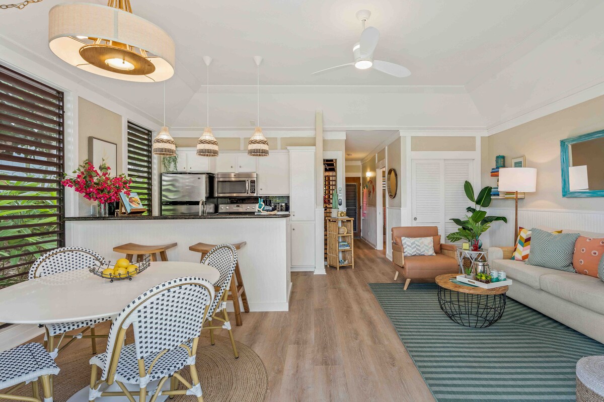 This bright and airy updated condo is the ideal place to stay in sunny Poʻipū for couples, honeymooners + small families. The open living space is clean and welcoming with a coastal boho vibe, and you'll enjoy beautiful ocean + garden views from the huge upper-level lanai. Location is the absolute best - from the beachfront property, you can walk to several of the best beaches on the south shore, local coffee, restaurants, shops, and the incredible pool within minutes.