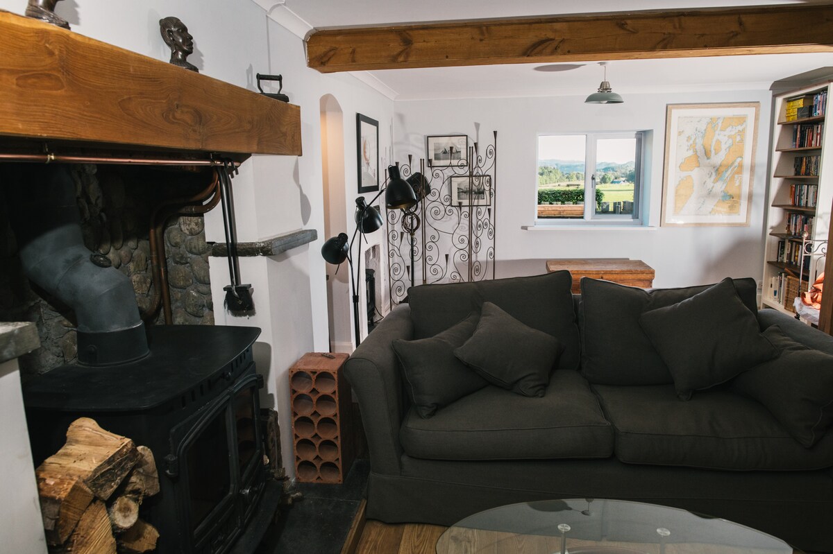Stylish, cosy cottage, located rurally, yet not isolated, 11 miles from Oban & 36 miles from Glen Coe. The perfect highland hideaway to relax, recharge, reconnect & enjoy stunning mountain views. Ideal for a couple or family due to open-plan design. One double bedroom & one king size bed on open-plan mezzanine area. Blackout blinds in both sleep areas. Super-fast broadband. Fully equipped kitchen. No additional cleaning fee will be added on. Car essential, free parking to door. Max 4 people.