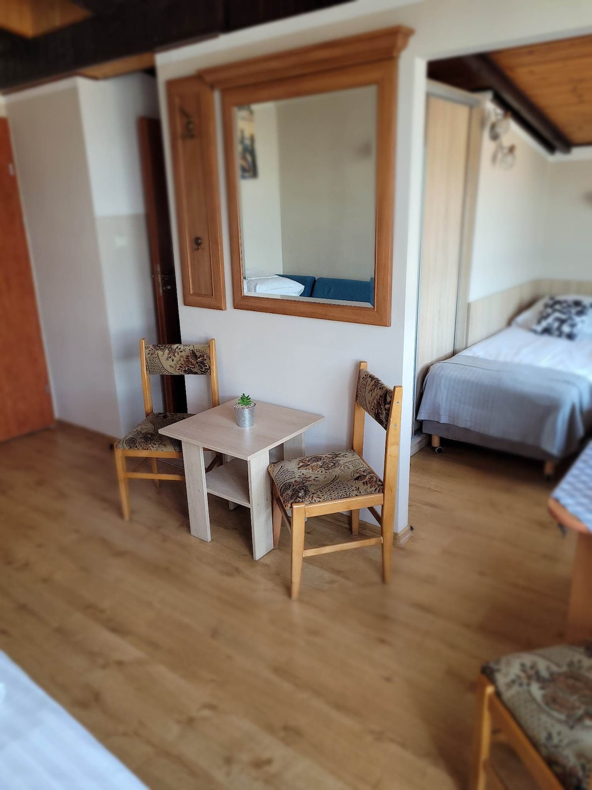 Basic Double Room with a 140 cm wide queen bed. Amenities in the facility: - Air-conditioned rooms and breakfast zone - WiFi - Elevator - The rooms are equipped with electronic locks - Taking care of the guest during their stay - Iron and ironing board - Free access to coffee, tea and homemade cake in the afternoons Additional services: Breakfast - 55 PLN/day/person Parking - PLN 50/day (earlier reservation required)