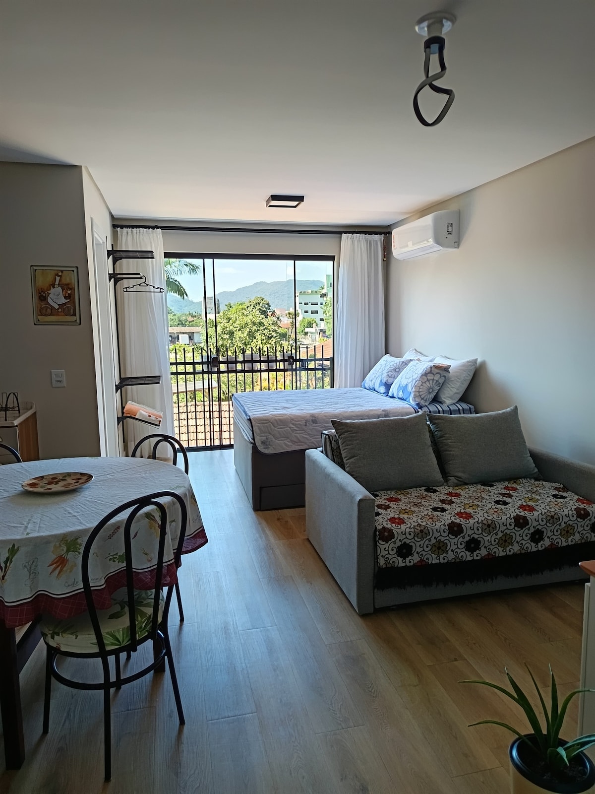 Central ground-floor loft with air conditioning and 1 private covered parking space. Walk to downtown, close to the city’s main attractions. Features 1 queen-size bed, 1 single bed, and 1 sofa bed (2 m). Includes bed linen and bath towels. Modern and cozy space, ideal for relaxing and exploring Pomerode. Free Wi-Fi. Come enjoy an unforgettable stay in the most German city in Brazil!