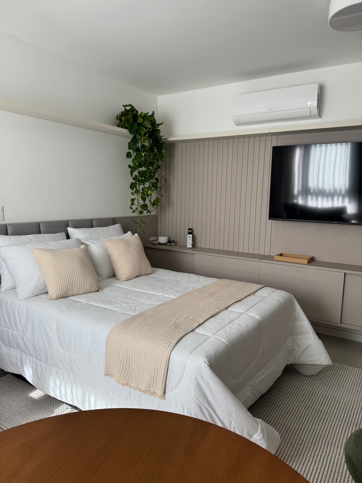 We understand that life is full of comings and goings, and we believe that the concept of home doesn't have to be fixed or definitive. The important thing is to provide a space where you can feel comfortable and free to live your way. Our studios have been designed with attention to detail, so that you can make this your home. The 44m² studio has a QUEEN bed, a SINGLE sofa bed, a 43” Smart TV and AC SPLIT.