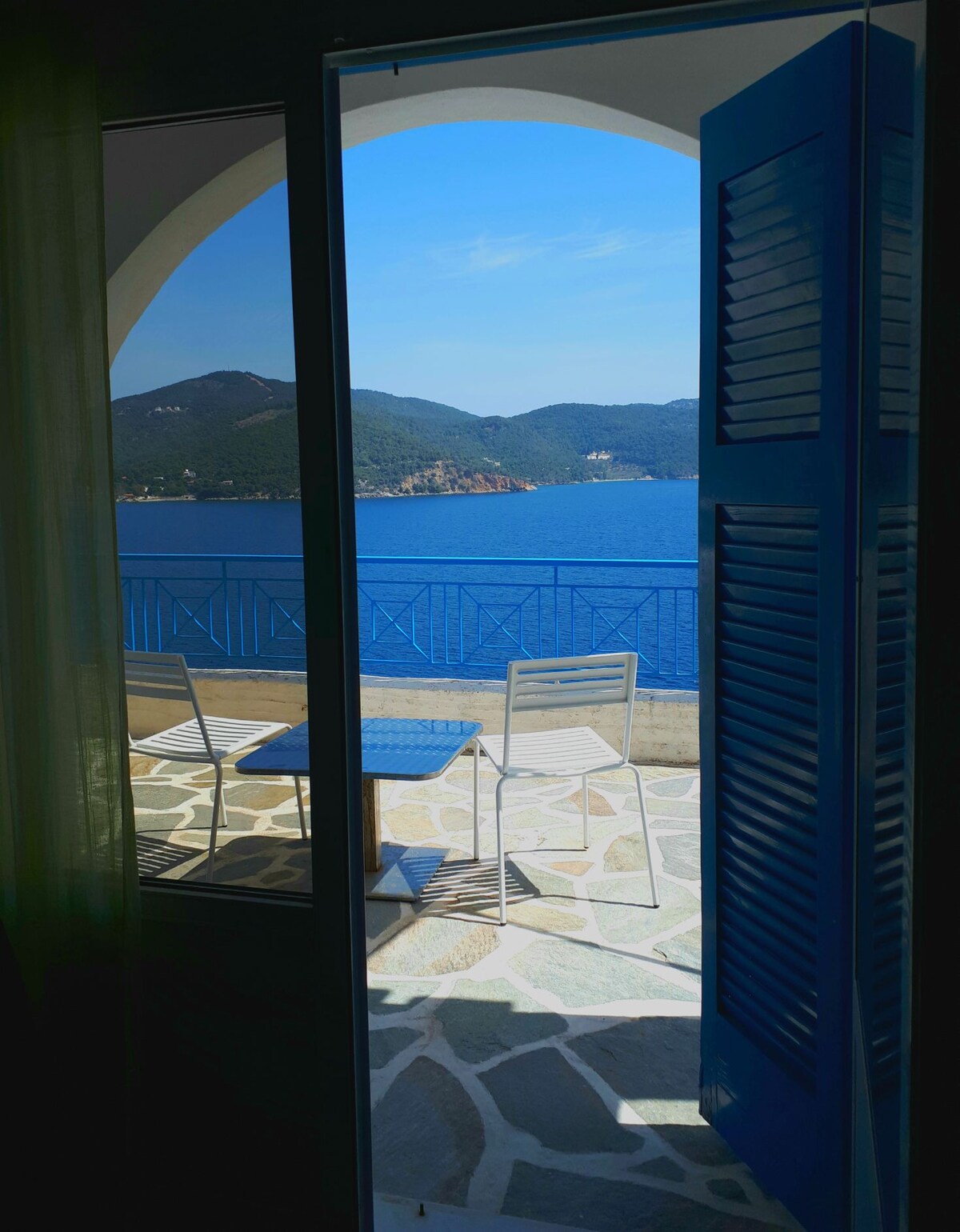 Quiet and peaceful.Brand new apartment with panoramic view .The sunrise and the sunset from the large terrace will enchant you,but also the nights with the moon illuminating the sea are beautiful.The view is also visible through the house.Is a hospitable place specially designed with a lot of love for visitors who want to relax and enjoy the beauties of the island.It will my pleasure to host you .Very quiet neighborhood near the center of the island and near the sea.
