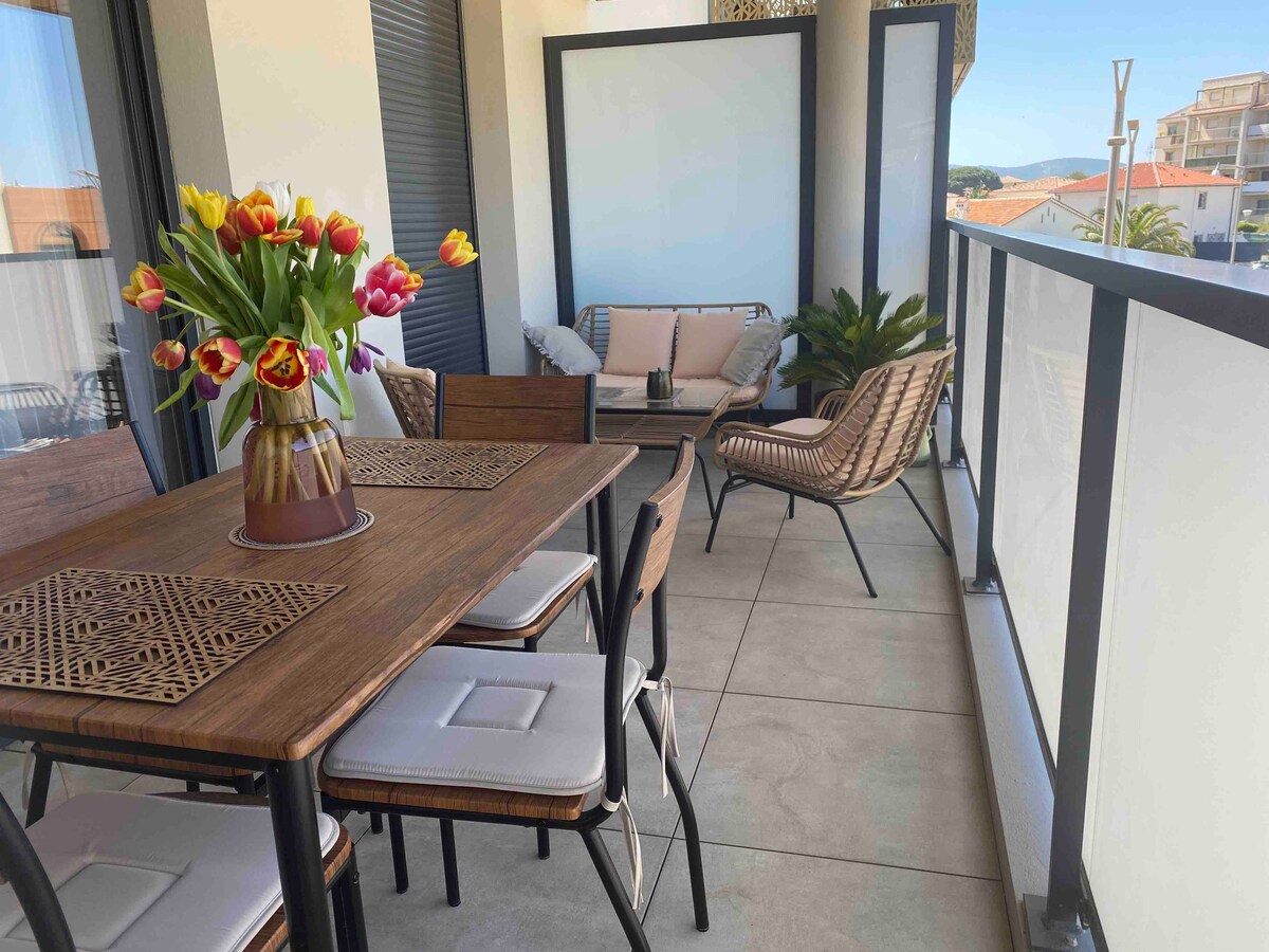 Nous avons aménagé notre Duplex de 42 m2 comme un petit Cabanon de bord de mer. Vue époustouflante au 3eme et dernier étage. Une chambre avec un lit de 160 x 200 sdb et WC séparés en haut. L espace du bas accueille une cuisine équipée, un canapé transformable en véritable lit de 160x200 Tout à pied. La gare de St Raphaël a 15 mn à pied. Aeroport 45 mn. Voyagez léger! Lits faits à l arrivée, draps de toilette et de plage à disposition ! Clim installée le 20 juin 2024
