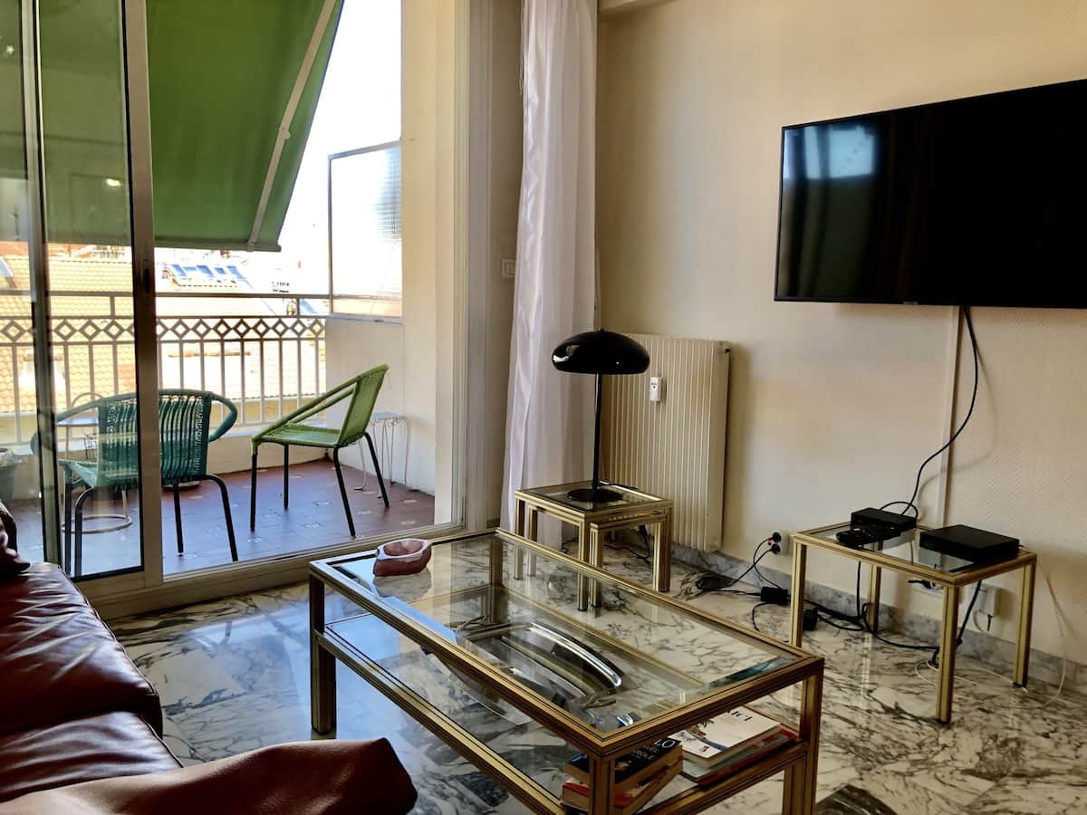 Bu müstəsna mənzil Promenade des Anglais-dəki yaşayış binasının 4-cü mərtəbəsində, yəni çimərliyin bir neçə addımlığında yerləşir. Mənzildə açıq mətbəxi olan böyük qonaq/yemək otağı, eləcə də 2 yataq otağı, 2 hamam otağı və böyük terras var. Mebellər dəblidir. Geniş balkon dənizə baxır və bütün gün günəş altında qalır (demək olar ki). Şəhərin mərkəzi ayaqla 15 dəqiqə və ya tramvayla 5 dəqiqədir.