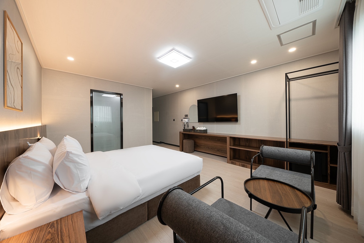 Rahat bir məkanda maksimum 3 nəfər rahat qala bilər. [1 kraliça döşəyi, qatlanan döşək və rahat yorğan, yastıqlar təmin edilir] Emosiya əlavə etmək üçün açıq havada barbekü mövcuddur! [Pulsuz qaz yandırıcısı təmin edilir] Xoş istirahət üçün şüa proyektoru ilə təchiz olunub [YouTube Premium, Netflix, Coupang Play mövcuddur] Dongguksa-nın düz yanında yerləşir Bura Gunsan səfərinizə başlamaq üçün mükəmməl yerdir.