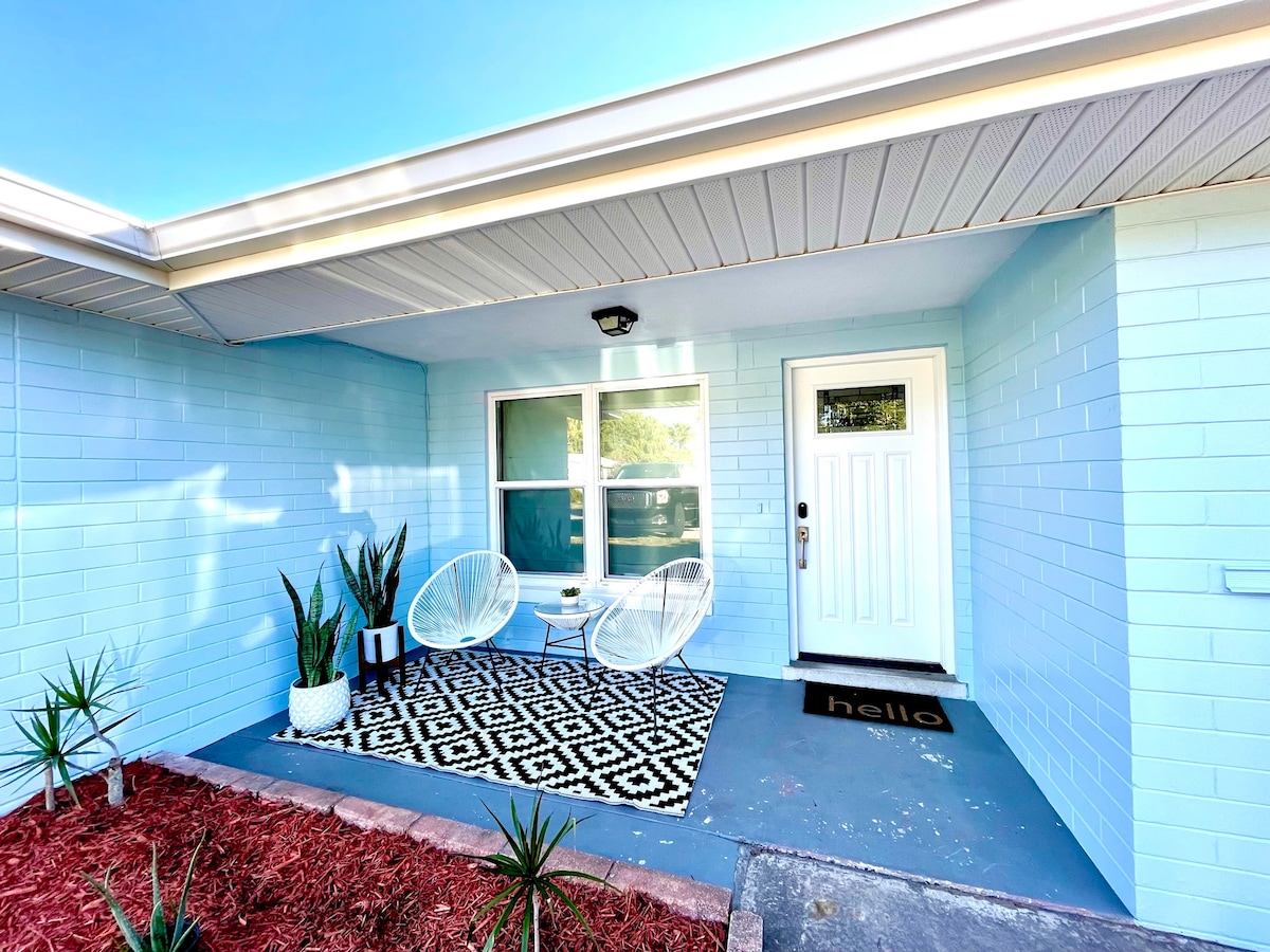 Newly renovated and located in a prime location. This is a great spot for your vacation. We are only a 10 min drive to the Beach and less than 15 min to international speedway. This house has an Open kitchen with stainless steel appliances and all the essentials! There is a fire pit in the backyard that leads out to a swing set, cornholes, and a screened in Heated pool with fun floats. The patio has a Monument propane grill, where you can BBQ and lounge under our pergola making fun memories.