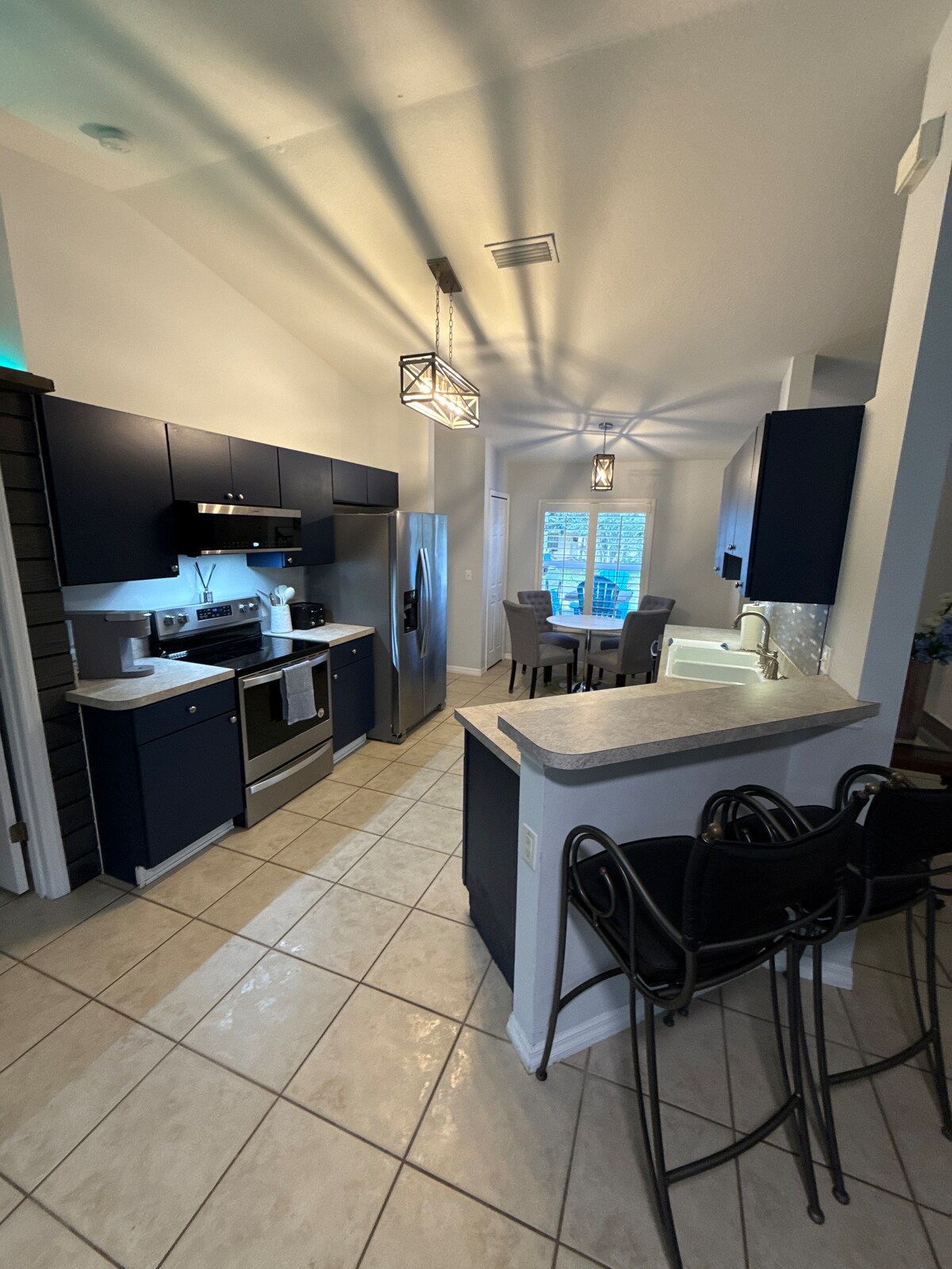Newly renovated and located in a prime location. This is a great spot for your vacation. We are only a 10 min drive to the Beach and less than 15 min to international speedway. This house has an Open kitchen with stainless steel appliances and all the essentials! There is a fire pit in the backyard that leads out to a swing set, cornholes, and a screened in Heated pool with fun floats. The patio has a Monument propane grill, where you can BBQ and lounge under our pergola making fun memories.