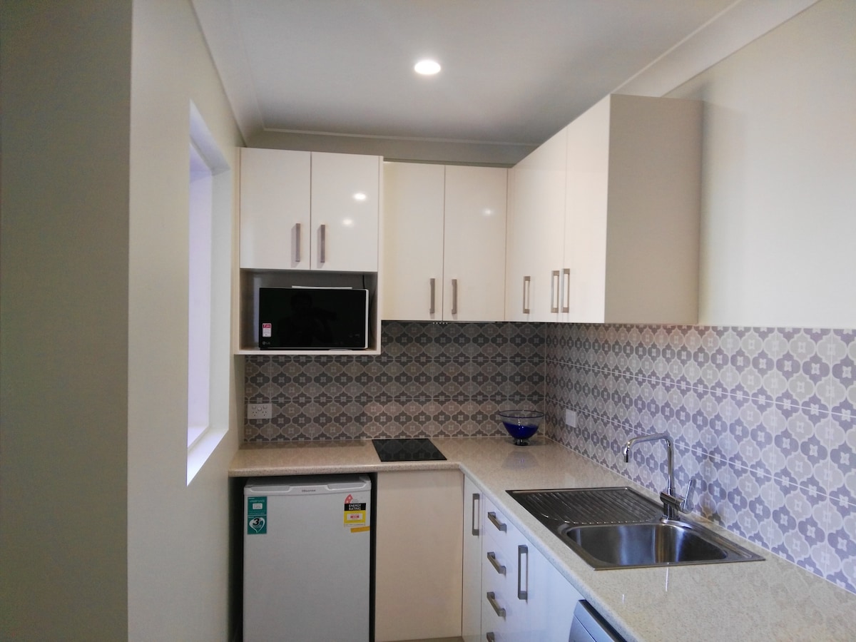We have a large comfortable self contained studio apartment, suitable for one couple only, with a private entrance, a small deck, Queen bed, kitchen with induction cooktop, microwave, bar fridge, dishwasher, cooking utensils, cutlery and some condiments supplied. It is in a quiet residential area with a 5 minute walk to our local beach where you can go for a nature walk, swim and watch the sunset. We live upstairs, so you may hear some sounds of life, but the studio is completely private.