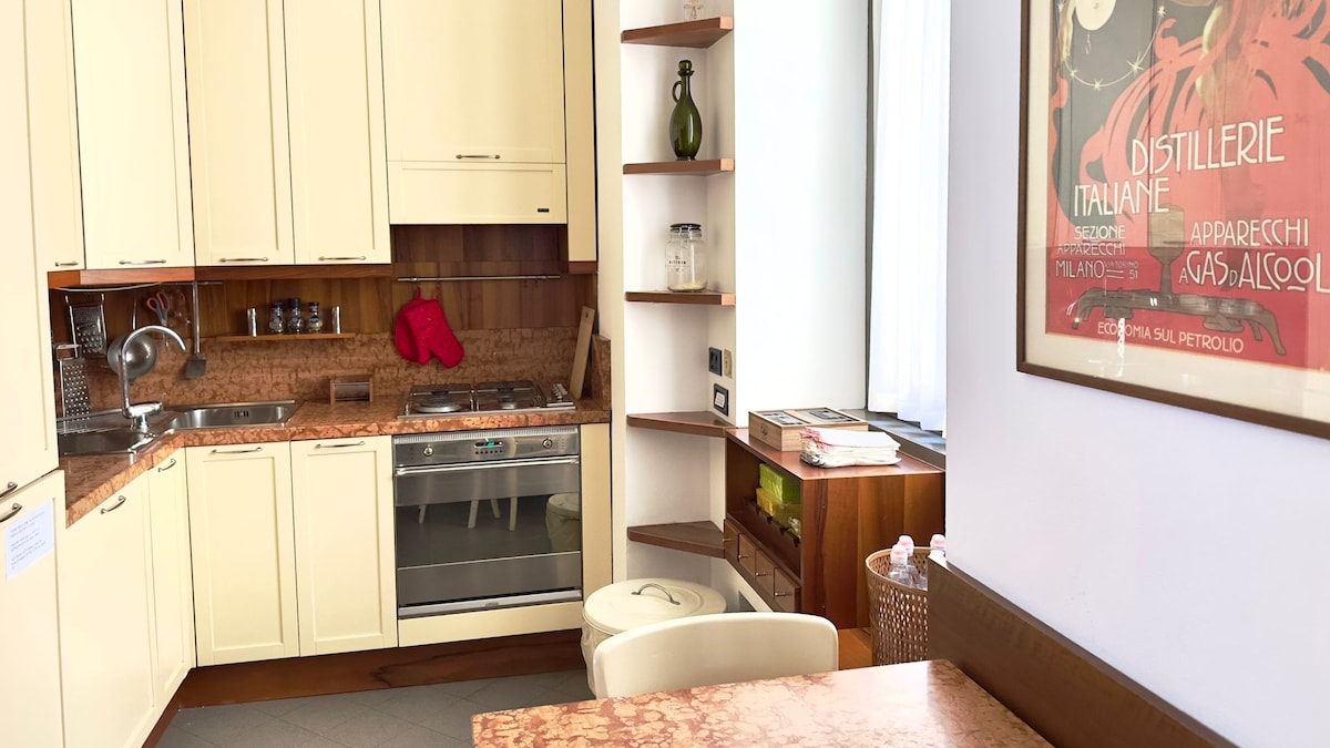 Wake up to the morning light in a historic building in Piazza Giovine Italia. High ceilings create a sense of space, while the living room, with wood paneling and a panoramic balcony, invites you to relax. The modern kitchen and dining area are perfect for intimate dinners, while the bedroom and spacious bathroom offer a serene retreat. A charming oasis where history and comfort meet, for an unforgettable stay.