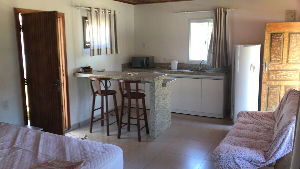 Enjoy beach life with the comfort of a home! This charming cottage offers stunning pool views from its balcony. Climb the Santos Dumont style staircase and find a cozy bedroom equipped with air and thermal-acoustic insulation. The fully equipped kitchen offer all the necessary amenities for a comfortable stay. Located just 350 meters from the beach, you can enjoy the sea breeze while enjoying the comfort of your own space. Come and experience the best of beach living!