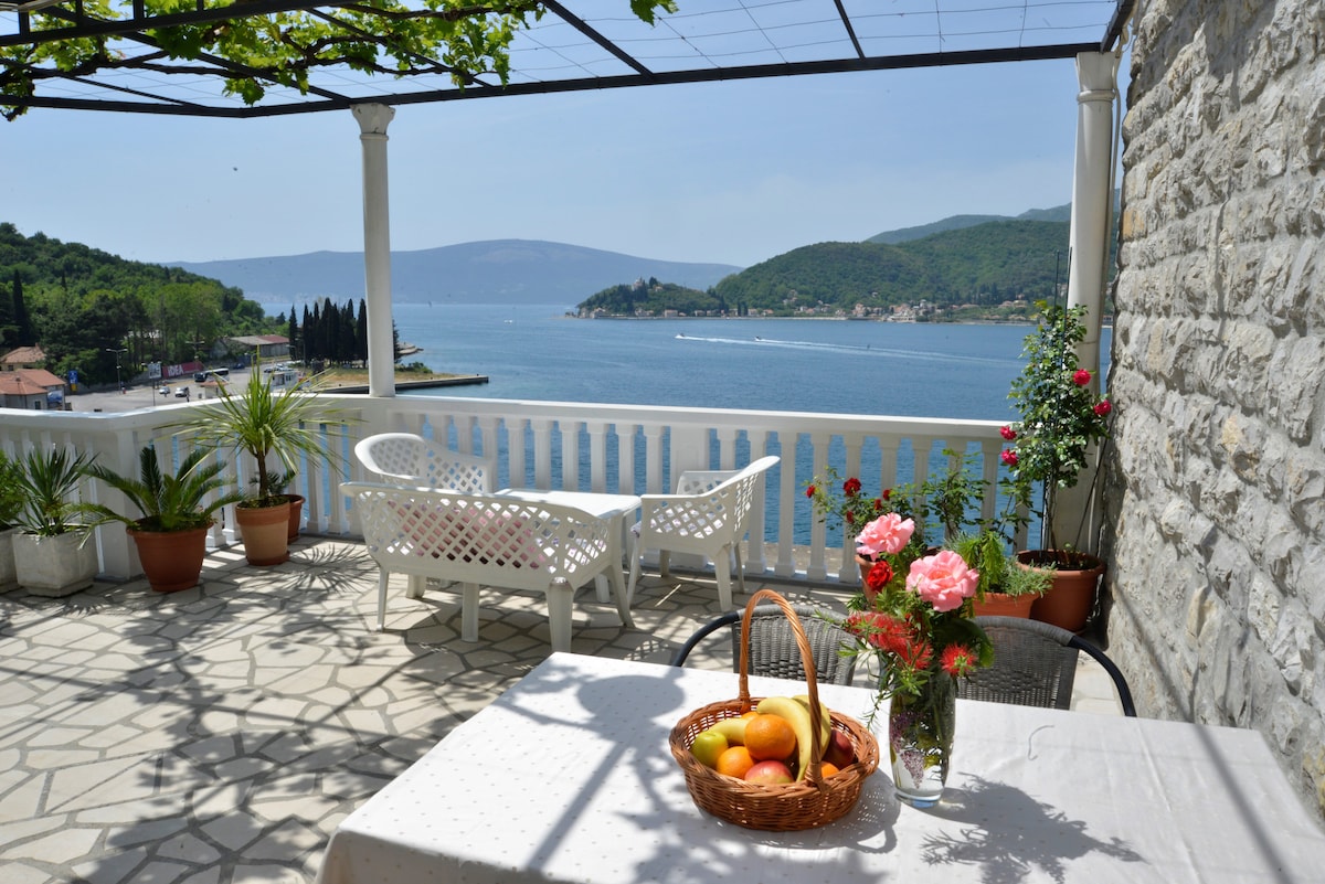 Beautiful apartment with great view on Boka Bay and Kotor. Apartment is modern furnished, has terrace ideal for relaxed stay with great location. Beach is on 50m from object. We are situated on 1.4 km away from Old town;going to Prcanj.Hospital,police and post are 300m away.Banks are in the Old town.Nearest supermarket is 300m away. Airports are on distance of:Tivat-7km,Podgorica-90km ,Cilipi(Croatia)-70km. Welcome , Kotor is living history in a spectacular bay