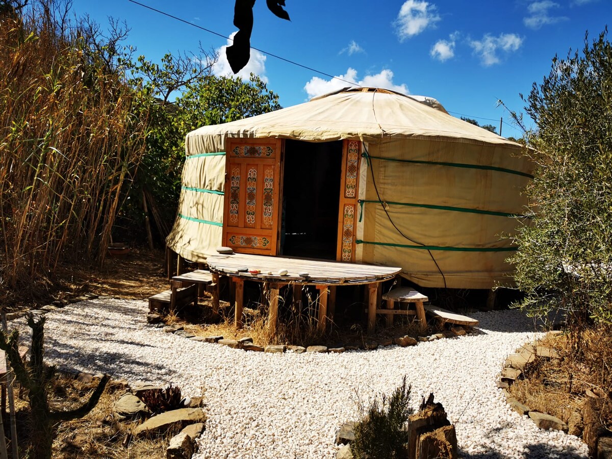 Onze yurt ligt midden in de natuur, aan een sinaasappelboomgaard en is sfeervol ingericht. De yurt is ruim (ca. 28m²) en comfortabel. Er staan twee luxe bedden, een fijne bank, een eet- en werktafel en een zitje en er is snel glasvezel internet. De yurt is voor twee personen en heeft veel privacy. Naast de yurt staat een houten unit met complete keuken en badkamer. Buiten zijn verschillende zitjes en ligbedden en een bamboe pergola met een picknicktafel.