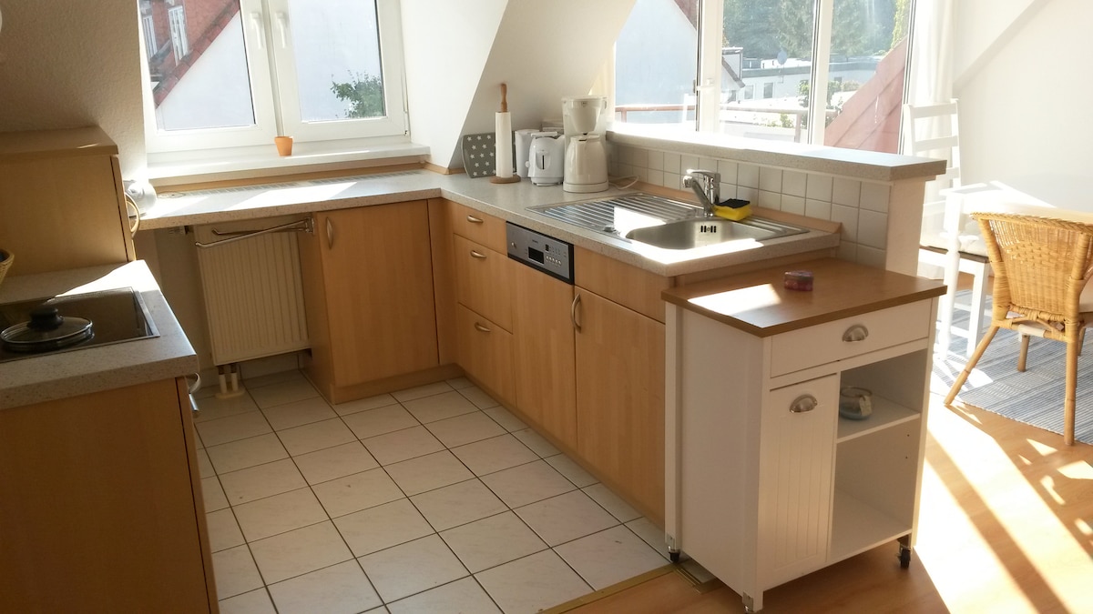 The apartment was renovated in 2020 and completely refurbished in the process. It accommodates up to four people and is super centrally located. If you like action, the river promenade is about 2 minutes away. If you prefer a calm place, the flat is located on the second floor and has a peaceful roof terrace overlooking the garden. Walking to the train station (connection to Lübeck) takes 5-10 minutes. Although you can't see the water, you can see the big ferries from the bedroom window.