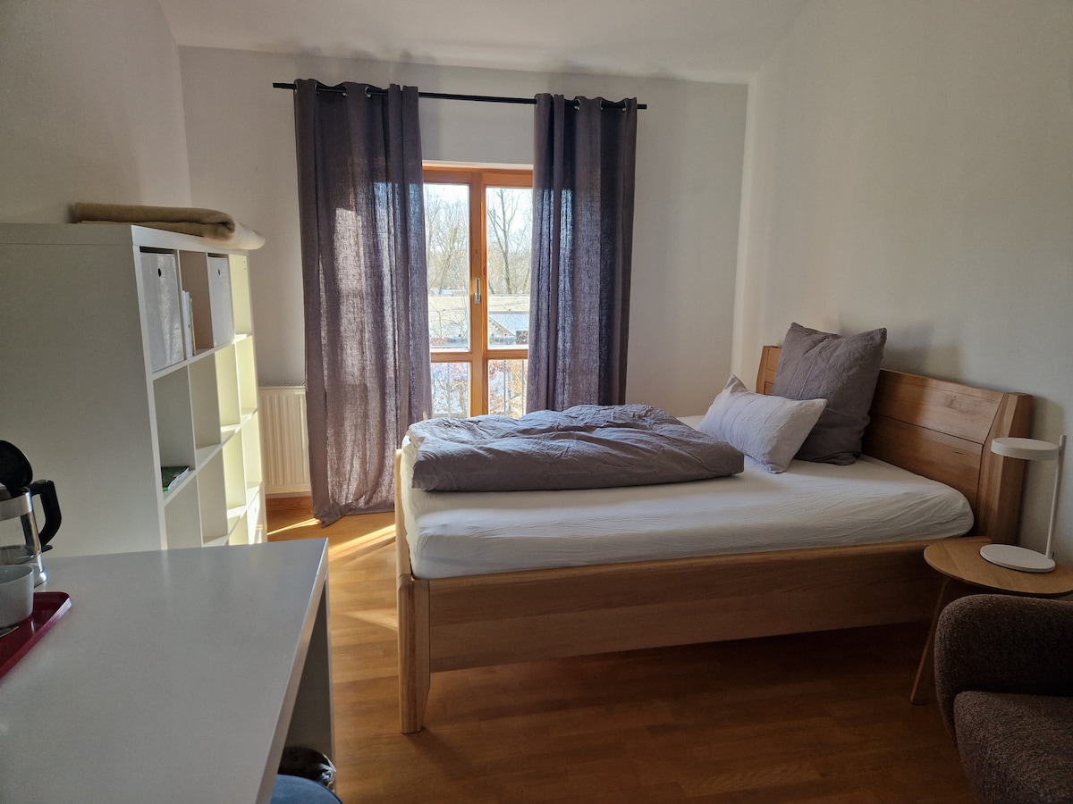 Bu sevimli mənzil göldəki kərpic villanın zirzəmisində yerləşir və öz gözəl, günəşli, qapalı terrası olan öz girişi var. Üzgüçülük üçün bağın qapısından birbaşa meşəyə və gölə, velosipedçilər və atletlər üçün əbədi əraziyə gedin. Mənzil Avusdan uzaqda rahat yerləşir. 2 əsas S-Bahn S1 və S7 xətti piyada 5 dəqiqəlik məsafədədir. Qonaq otağında çarpayısı (1,60m x 2m) olan yataq otağı və divan-çarpayı var.