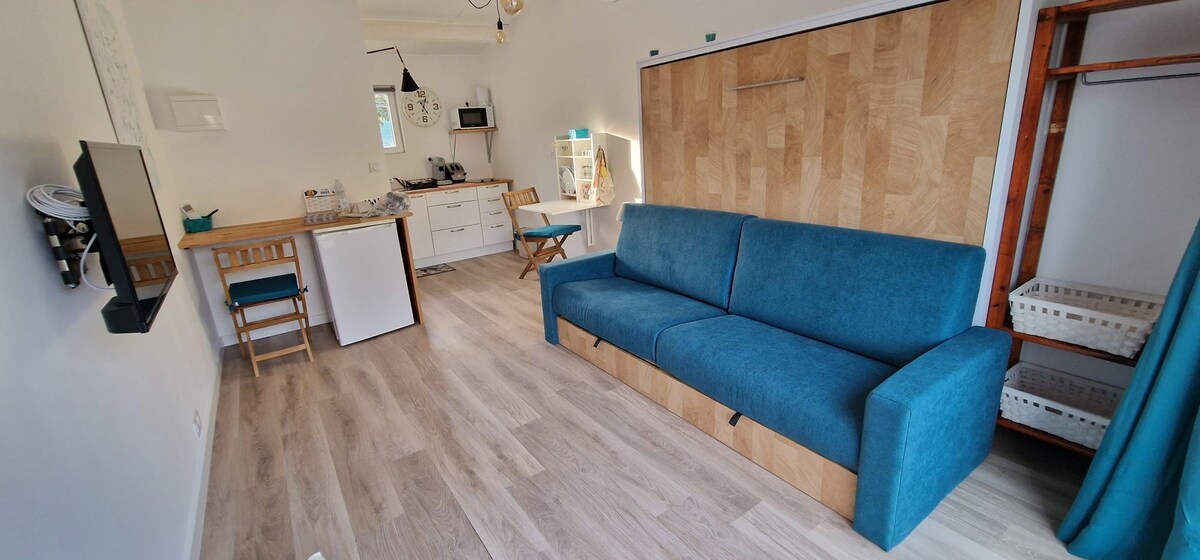 Frontignan çimərliklərindən 20 dəqiqə və Sète çimərliklərindən 25 dəqiqə, Balaruc les Bains termal hamamlarından 8 dəqiqə və Thau gölməçəsindən 5 dəqiqə məsafədə yerləşən Poussan şəhərinin yüksəkliklərində sakit bir yaşayış sahəsində 17 m2-lik müstəqil studiya. təchiz olunmuş mətbəx, kraliça böyüklüyündə çarpayı, hamam otağı, kiçik açıq qonaq otağı və ayrıca hovuza birbaşa giriş (iyun və sentyabr ayları arasında istifadə edilə bilən və sahibləri ilə paylaşılan).
