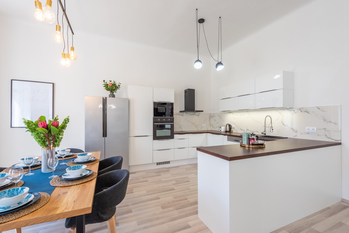 Köhnə qalıq məhəllədə qeyri-adi mənzərələri olan geniş və işıqlı yer. Lüks mebelli mənzil qonaqlamanızın hər anında rahatlıq təklif edir. Tam təchiz olunmuş mətbəx, duş və valehedici mənzərəsi olan vanna otağı, Netflixli televizor, rahat çarpayısı olan sakit yataq otağı. Kafelər, çörək zavodları və bistroslar, ən yaxşı çex pivəsi və mətbəxi olan pablar, qapının yanında yerli bazar. Hava limanına, qatar stansiyasına, Praqa qəsrinə, Köhnə Şəhər Astronomik Saatına birbaşa ictimai nəqliyyat.