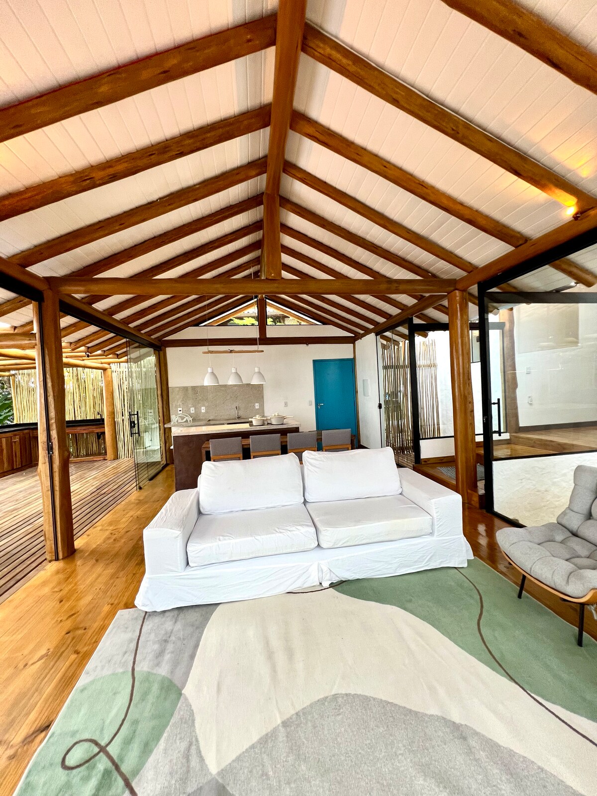 Projeto de Carlos Lemos, nossa casa é térrea, espaçosa, e super iluminada. Situada num terreno com vista privilegiada para o mar e as montanhas. Está cercada pela mata atlântica, com poucos vizinhos, à cerca de 500mts da praia. A casa é bastante equipada com uma cozinha e lavanderia completas, e tem internet rápida (100Mb) com wi-fi em todos os ambientes. A sala de estar tem lareira e a varanda área externa é bastante ampla com deck, redes e churrasqueira portátil.