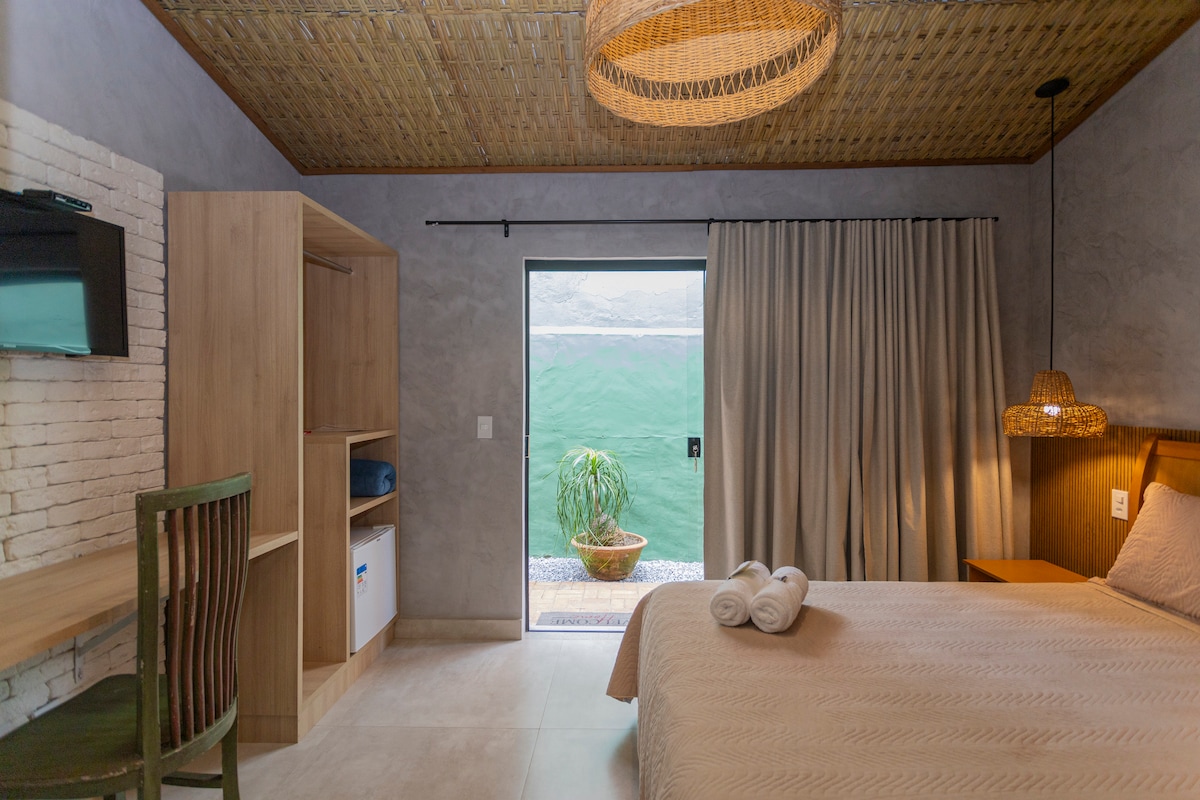 Studio no hotel 4 estrelas em SANTÉ Búzios, a 2 min da Praia do Canto de Geribá, trecho ótimo para crianças e surfistas. Para até 5 hóspedes, com quarto, sala integrada, varanda, ar-condicionado e TVs. Mini cozinha com cooktop, geladeira e utensílios. Banheiro com amenities. Acesso à piscina com telão, sauna, academia, área kids, salão de jogos, restaurante, jardins, estacionamento coberto, recepção 24h e limpeza diária. Café da manhã opcional (pago a parte)