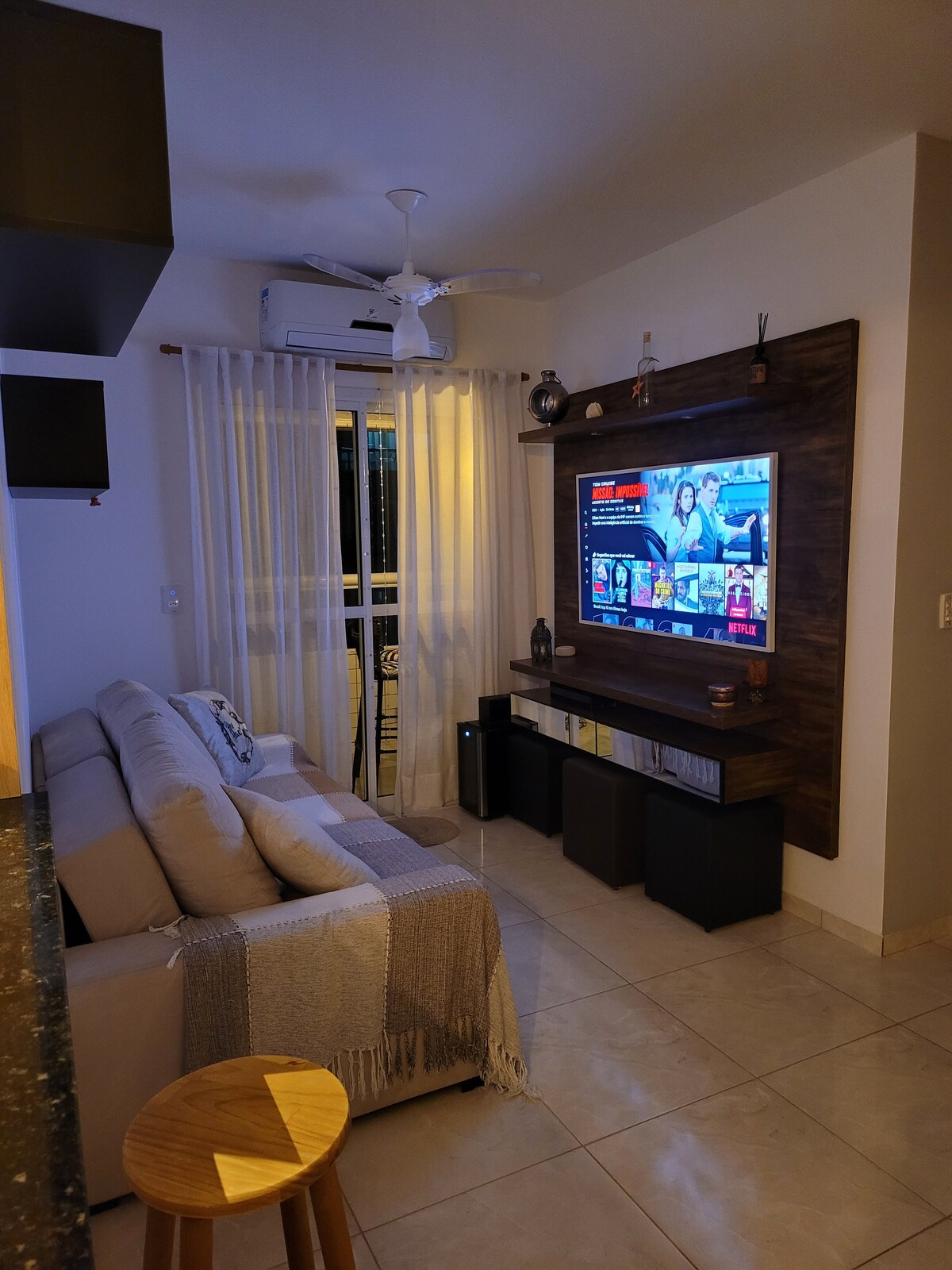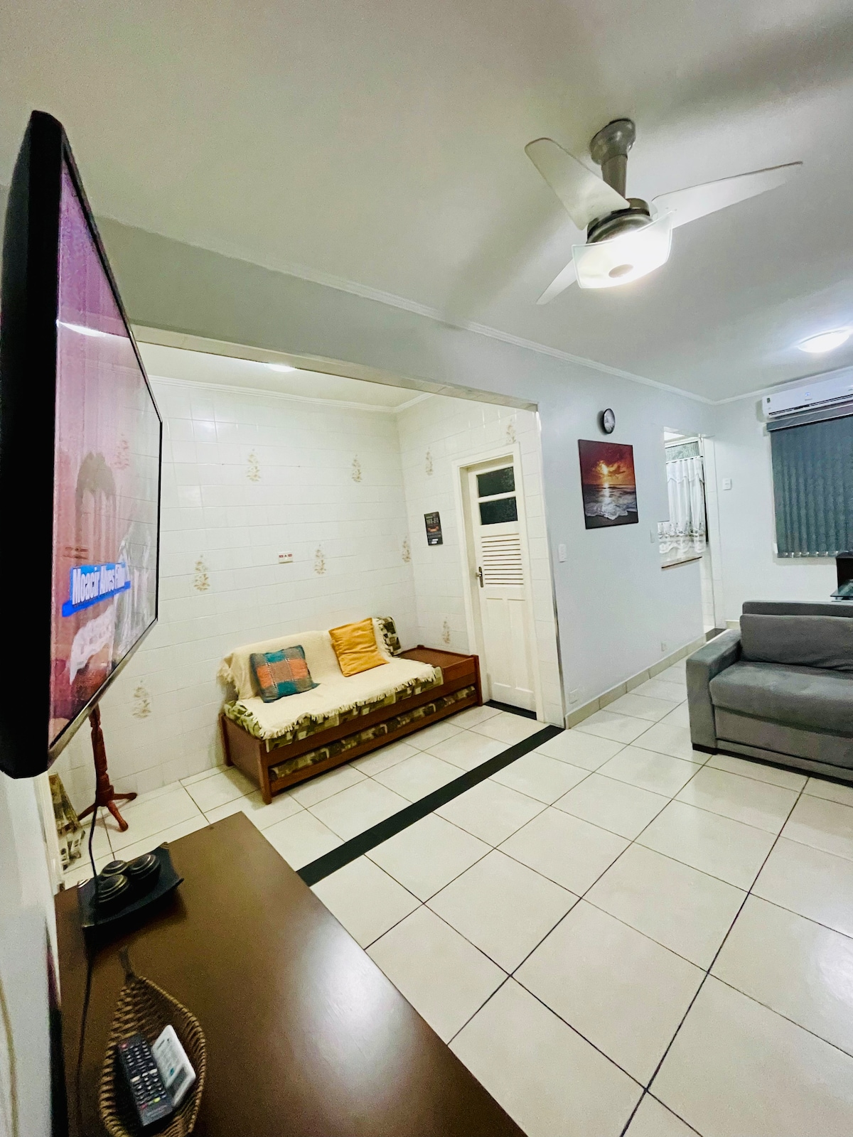 Apartamento amplo de 80 m² no Boqueirão, frente-mar, com varanda enorme e churrasqueira. Pet Friendly, perfeito para famílias. Possui dois quartos, dois banheiros, ar-condicionado, mobília completa e utensílios de cozinha. Localizado no melhor ponto da Praia Grande, ao lado de supermercados, restaurantes, farmácias e todo o comércio. Apartamento também conta com uma vaga coberta. Conforto, praticidade e o mar bem na porta. *Antes de reservar nos feriados consulte o número mínimo de diárias.
