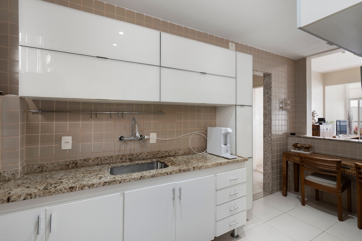 Enjoy a stunning and unique view of both the ocean and the mountain in a centrally located 2 bedroom renovated apartment in Leme, Copacabana ideal for families and couples. The apartment is cozy and has everything you need to make you feel at home. A very spacious and stylishly decorated living room, and a fully equipped apartment. One bedroom has a queen bed, the second bedroom has 2 single beds, and there are 2 more mattress/futons that can be placed in the living room if needed.