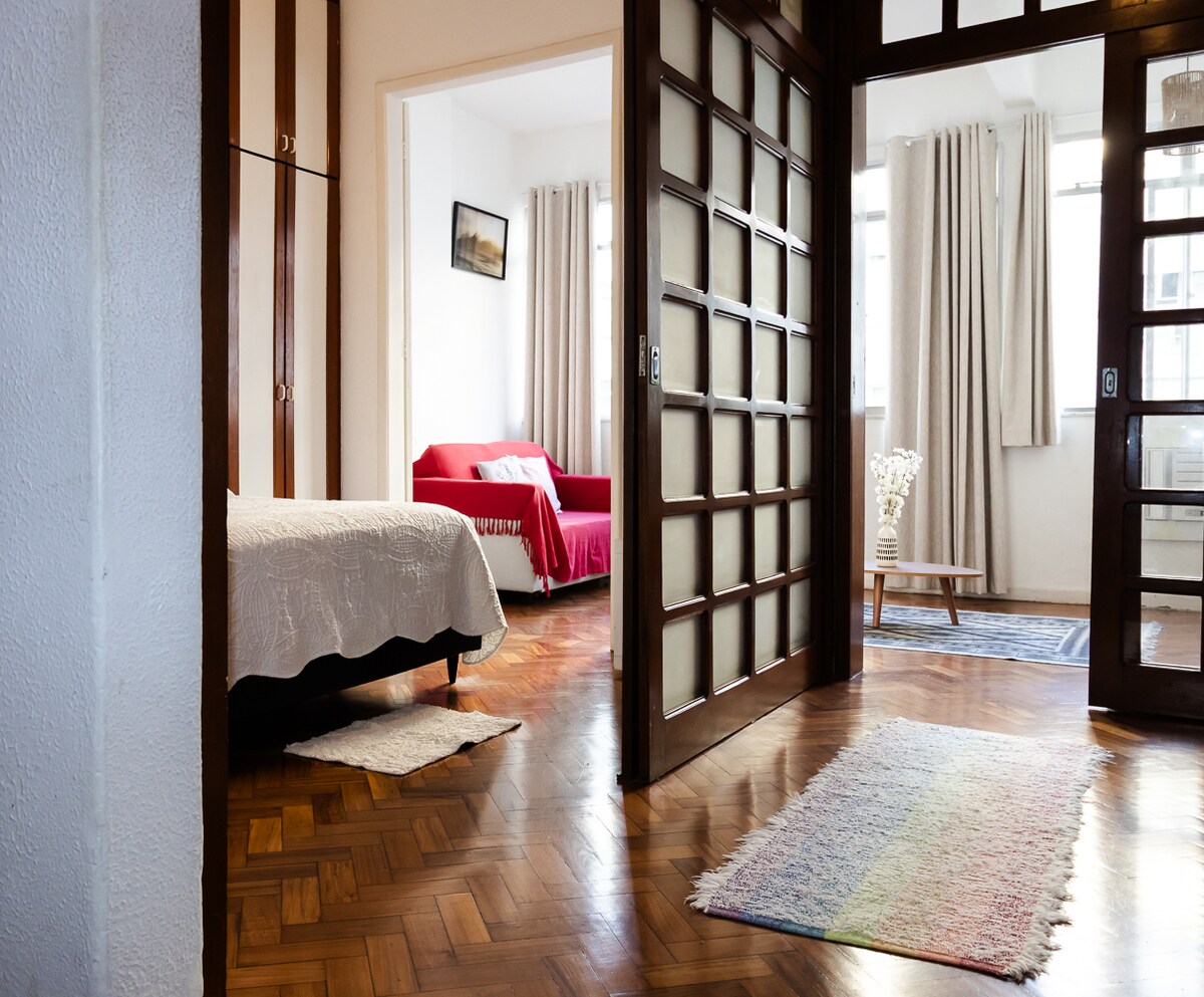 Boho qəşəng üslublu mənzil, Kopakabana çimərliyində! - Kraliça çarpayısı, divan çarpayısı, yemək masası, kondisioner və ev ofisi üçün yer (Wifi 300Mbps). Soba, soyuducu, soba, mikrodalğalı soba, blender, qəhvə maşını, şirəçəkən, sendviç maşını, tavalar, mətbəx ləvazimatları, müxtəlif kitablar, gitara və televizor ilə təchiz edilmiş mətbəx. - Binanın altında market və aptek, mənzilin ətrafında restoran və mağazalar. - Hava limanı 8.3 km - Kristo Redentor 11.5 km - 2.8 km məsafədə Pão de Açúcar