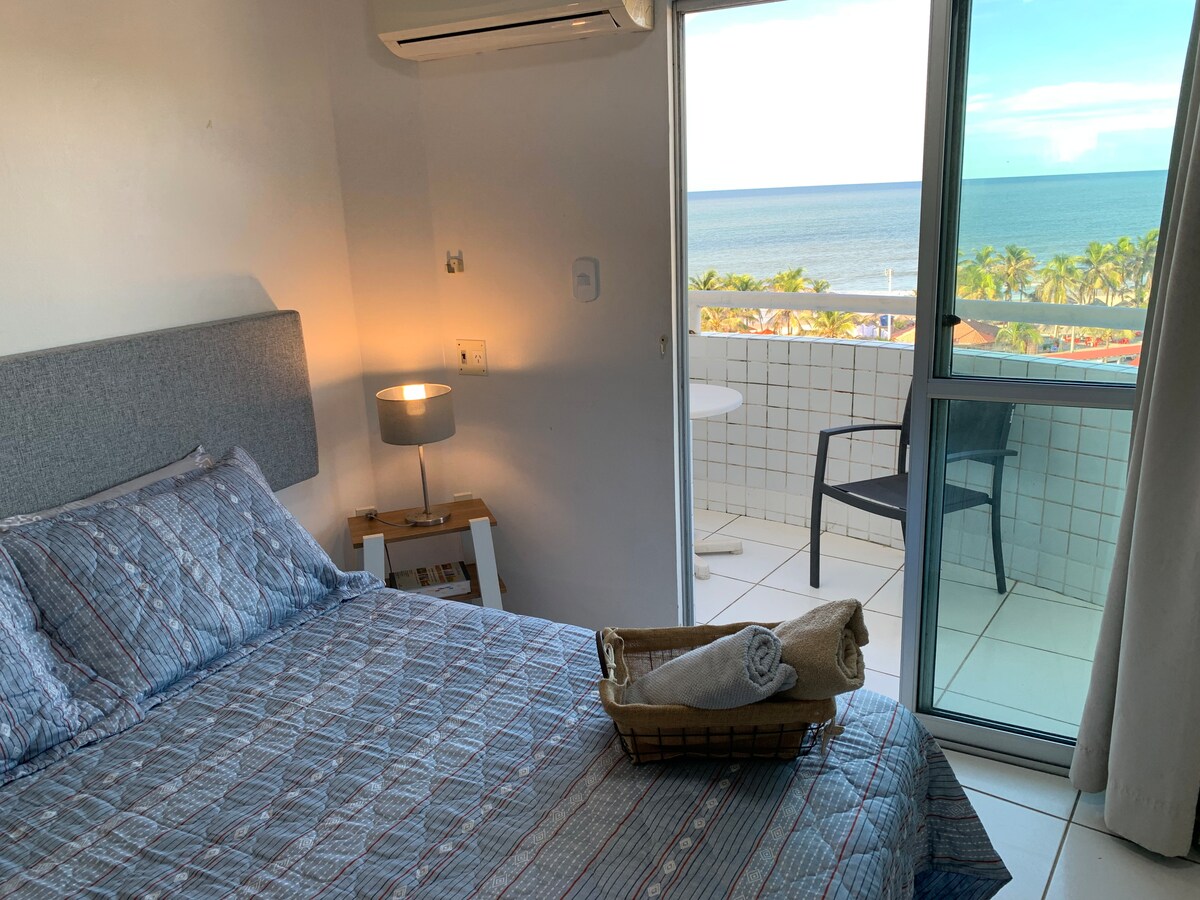 Imagine acordar com o som das ondas e uma vista panorâmica do mar logo na sua varanda. Ideal para casais, famílias pequenas ou viajantes sozinhos. 📍 Localização privilegiada: De frente para a praia. Próximo a mercados, restaurantes, barracas, etc. 1 quarto com cama de casal, ar-condicionado, TV com streaming TOP HD. Sala com sofá cama, ventilador, TV Cozinha com utensílios, fogão, geladeira e micro-ondas. Sinal de Wi fi forte- 700 mega. Roupas de cama e banho inclusas Estacionamento no local.