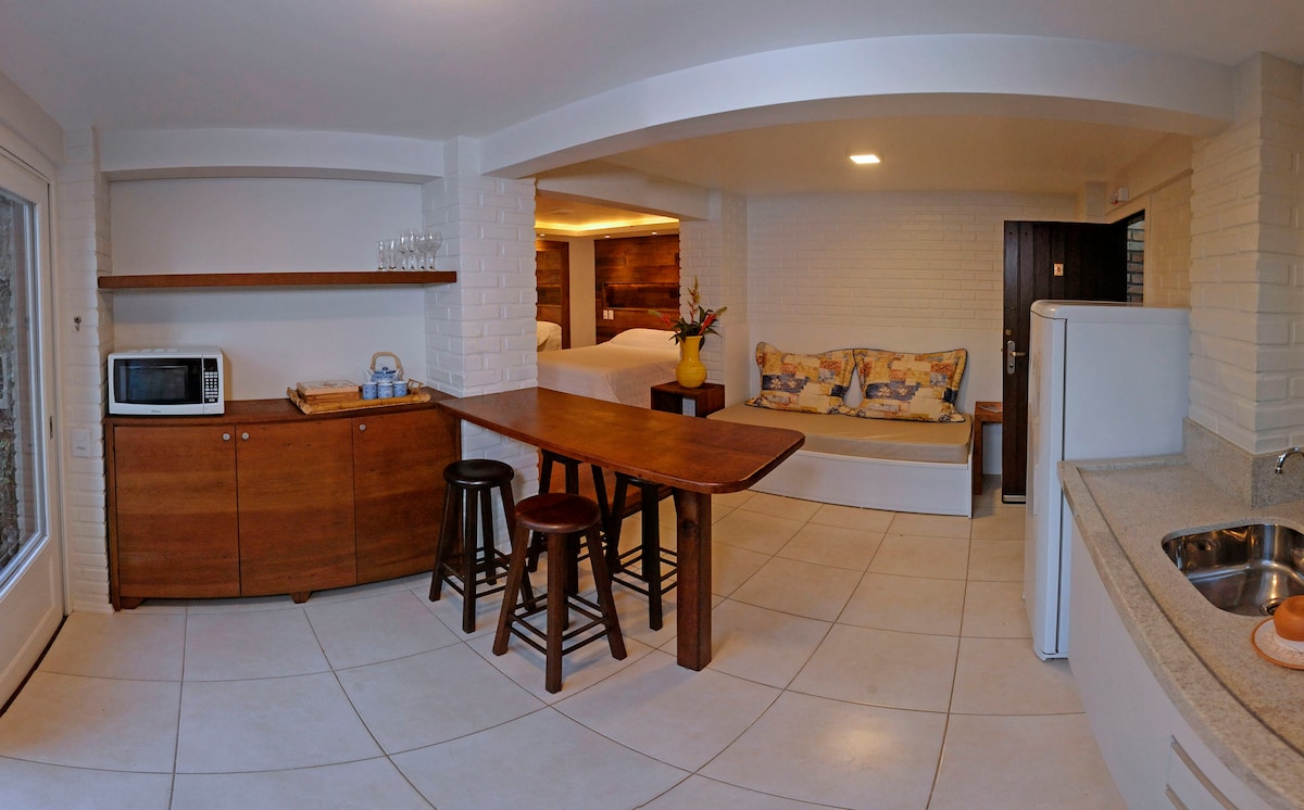 A Suíte Farm é o seu refúgio de design no coração da Praia do Rosa. Perfeita para escapadas românticas ou foco total em Home Office com Wi-Fi Premium. • Localização Imbatível: No centro, faça tudo a pé. • Conforto: Cama Box Casal, Coffee Bar (frigobar/micro-ondas) e banheiro privativo. • Vibe: Design boutique rodeado por um jardim nativo exuberante.