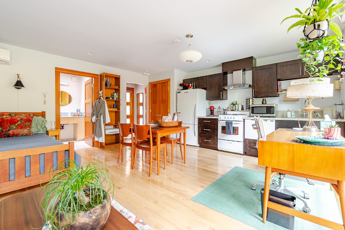 Originally built in 1956 and fully remodeled in 2015, our studio delivers "retreat vibes". The entire east wall is floor-to-ceiling windows with views that peek through trees and show glimpses of Lake Washington. Sunrises can be enjoyed from bed, or experience total blackout with floor to ceiling vertical blinds. Cozy queen bed featuring an organic mattress with an Avocado topper and linens. Full kitchen with brand new appliances, big walk-in shower with a luxurious steamer. W/D included.
