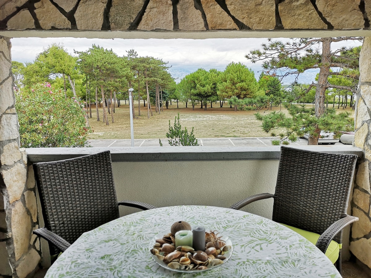 Mənzil Tina dənizə gedən ilk cərgədə yerləşir və uşaqlı ailələr və ya Velebit dağına baxan bir qrup dost üçün ideal yerdir. Mənzərə rahat və rahatdır və hər şey yaxınlıqdadır. Mərkəz 200 m məsafədədir və burada bazarlar və suvenir mağazaları tapa bilərsiniz. Məşhur 3 km uzunluğunda qumlu Kraliça Çimərliyi cəmi 150 m məsafədədir. Tibbi palçıqla da tanınır.