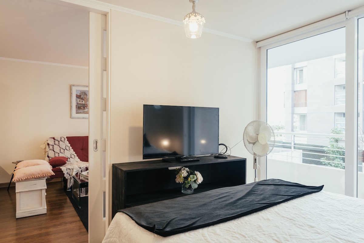 Cozy and harmonious minimal style apartment fully equipped for 4 people, Wi-Fi, 24 hrs autonomous entrance and concierge, private parking, common areas and services included. Excellent location! Safe neighborhood, one block from the Santa Isabel metro, walking distances to Barrio Italia, Providencia, Santa Lucía hill, San Cristóbal hill and Plaza Italia (Plaza Dignidad). Close to banks, ATMs, supermarkets, warehouses, bakeries, cake shops, cafes, pubs and restaurants.