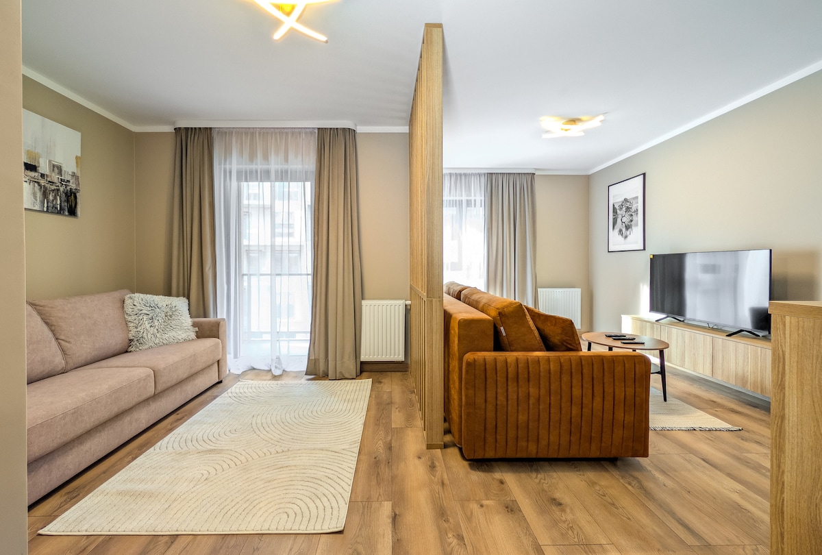 A fresh, luxury apartment in downtown Wroclaw. Located in a new modern apartment building with an elevator. Quiet, secure, and well-situated. Just a few minutes walk to the city center. Spacious balcony with a breathtaking view. 400 meters from the Main Market. Free high-speed fiber optic WiFi, 55" 4K SMART TV, AC. Free underground, secured and monitored parking place !