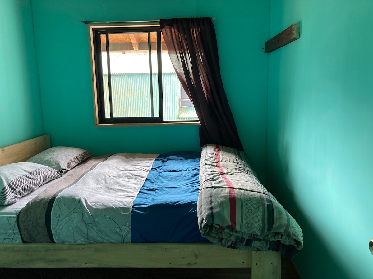 Habitación con cama matrimonial, con vista al bosque, puedes disfrutar de la naturaleza mágica en un ambiente místico, puedes pescar y bañarte en el rio