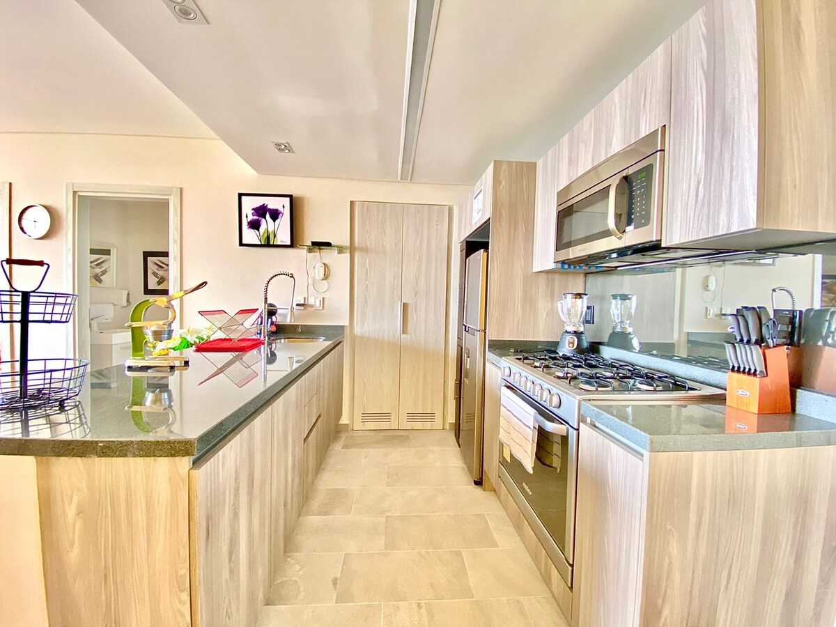 Bright, modern high-rise space on the 18th floor with open city views. Ideal for couples, friends, and relaxed longer stays. 3 Queen beds for up to 6 guests Equipped kitchen Large-capacity washer and dryer machine. Electric blinds and high-speed Wi-Fi for home office. Enjoy a 24/7 GYM, rooftop, and in-building parking for 2 cars. Pet-friendly building with security service and 24/7 security cameras. Quick access to Cholula (5 min away), Angelópolis (8 min away), and key attractions