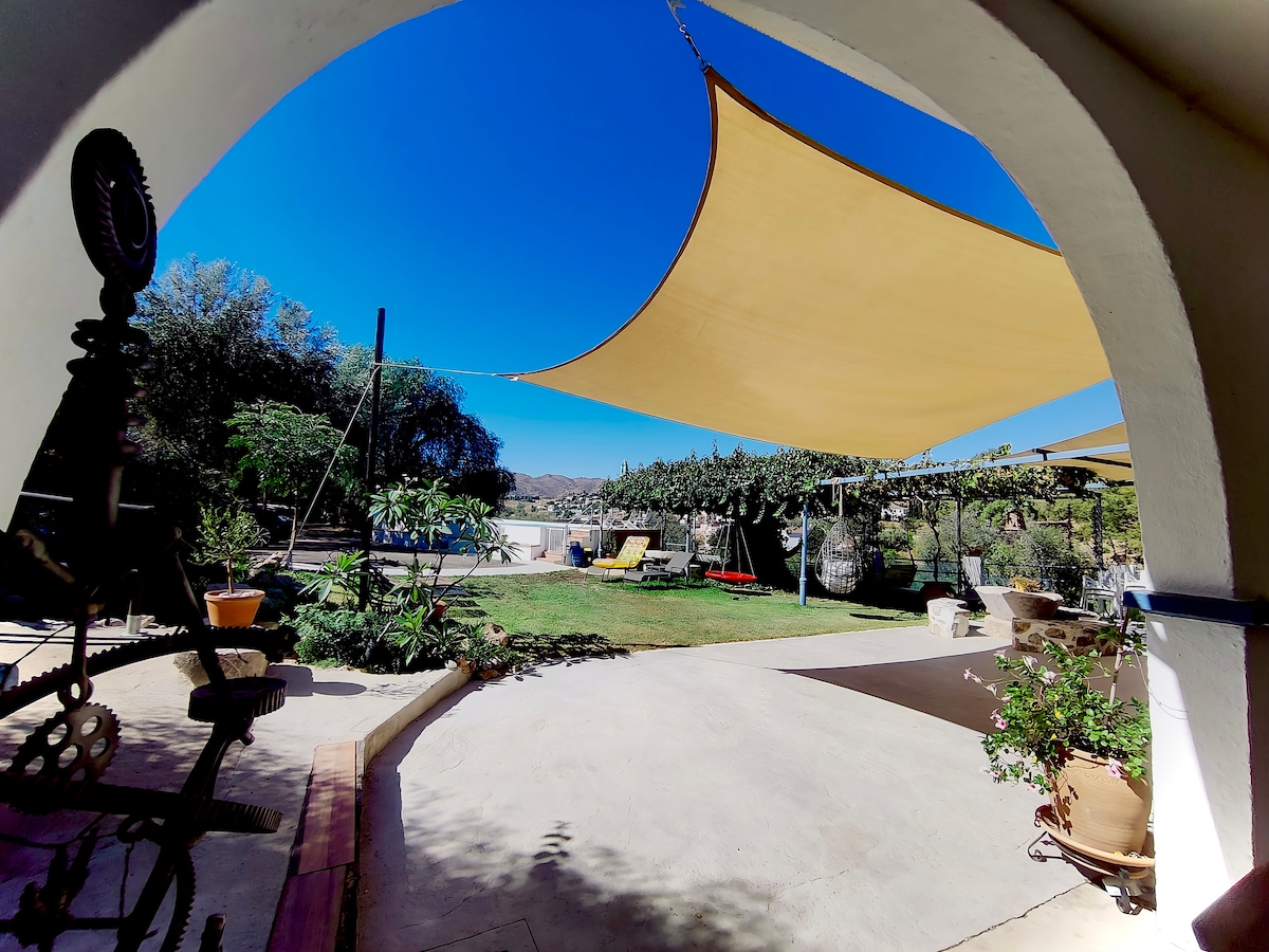 ThinkersINN, stable INTERNET, H/OFFICE, Double infinity POOL + Heated jacuzzi. A peaceful oasis invites you In the evening you can enjoy great Andalusian food, drinks, and music in the city center. There are 2 studios on the side of the Hacienda, the pool is private and belongs only to our house. The bedroom (bed 2m long), rainforest shower, AC, SmartTV, glassed terrace, kitchenette, Weber gas grill Our house is very quiet and private, just on the edge of the center, on Tarmac road/free parking.